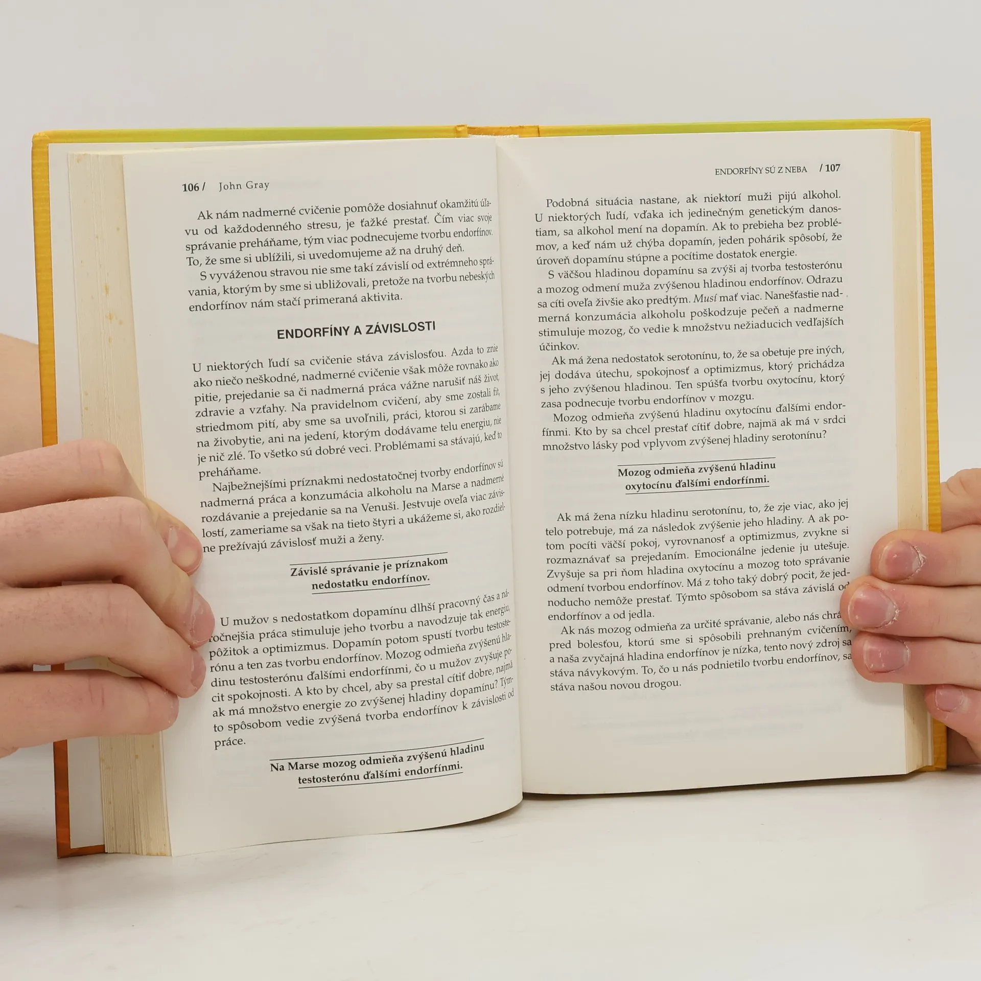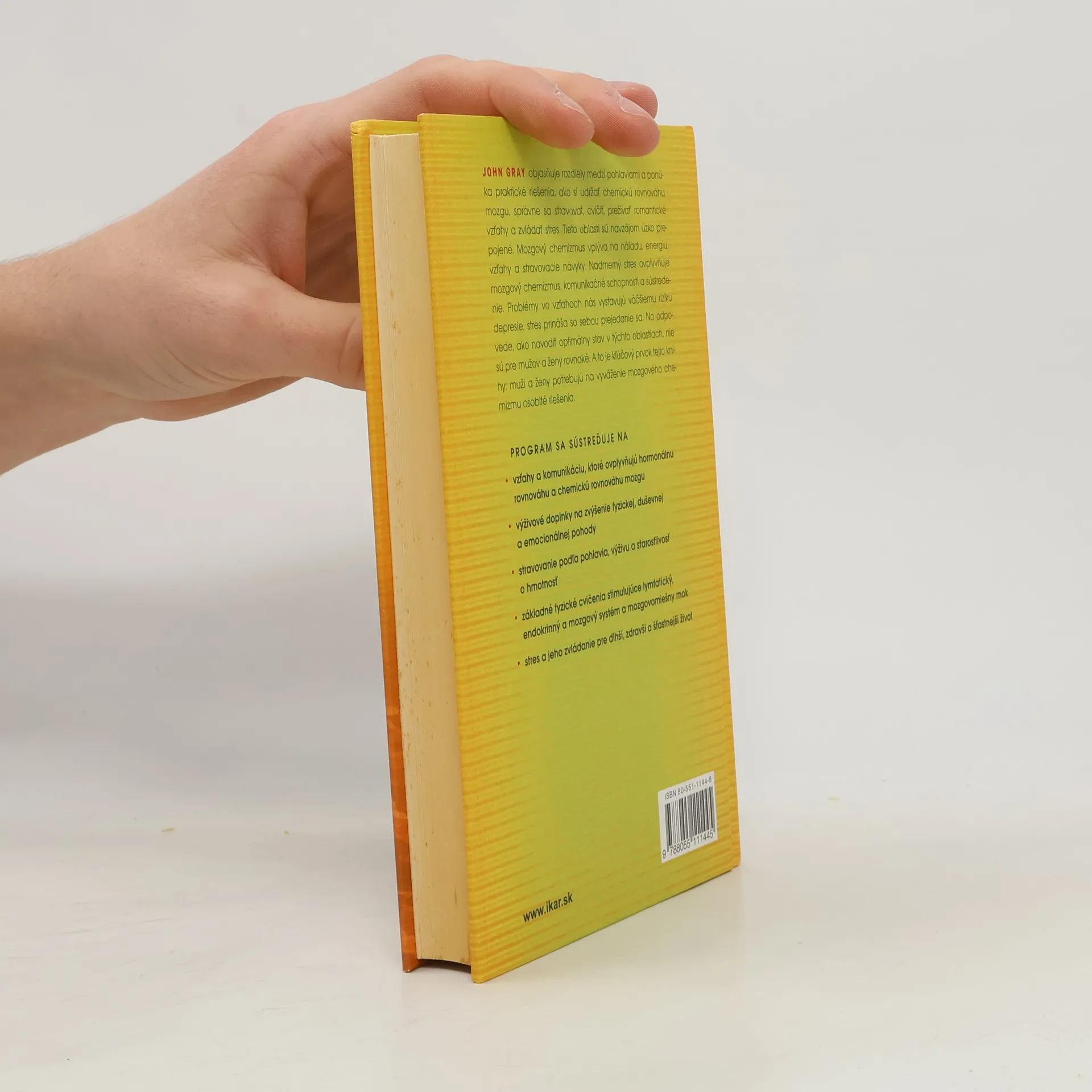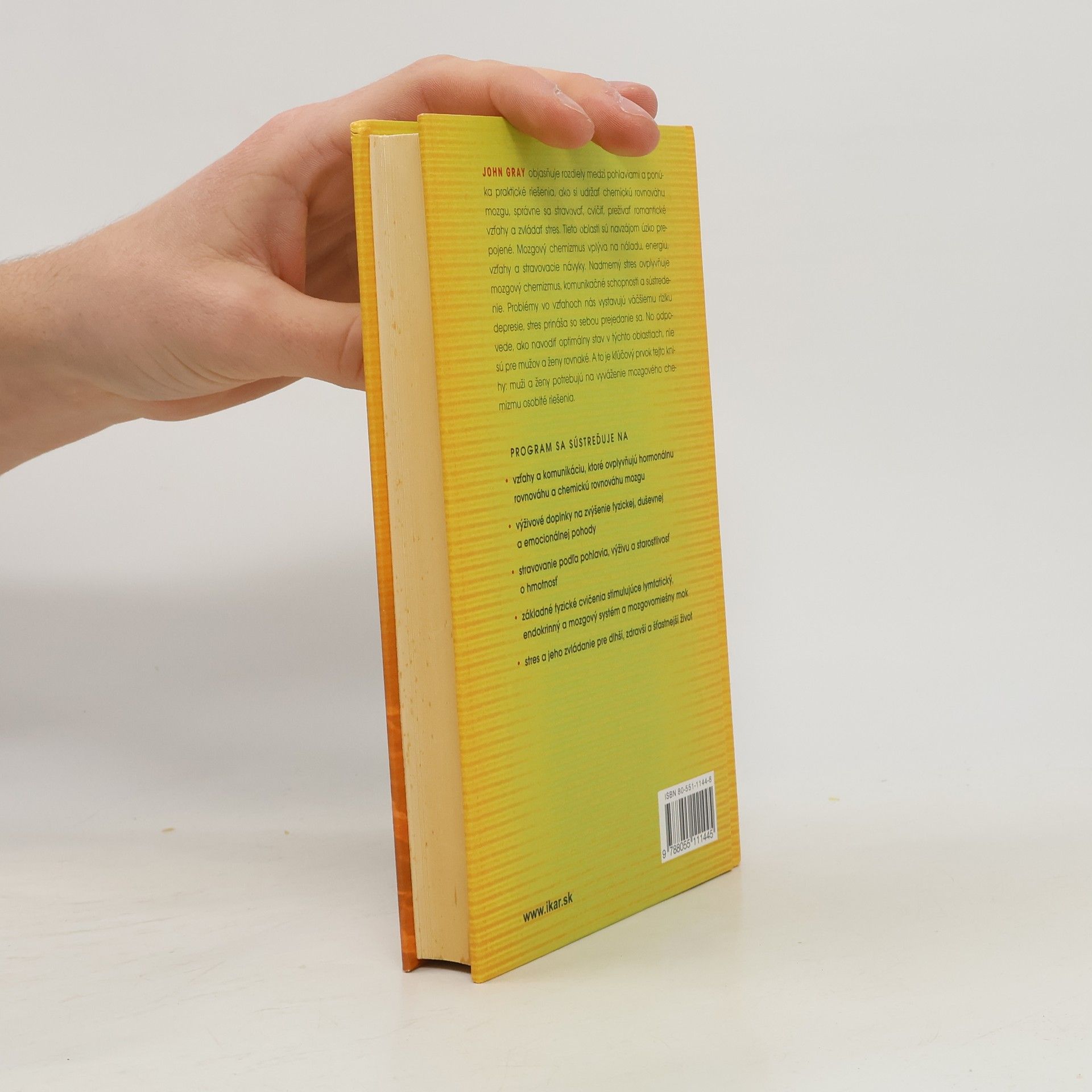 John Gray objasňuje rozdiely medzi pohlaviami a ponúka praktické riešenia, ako si udržať chemickú rovnováhu mozgu, správne sa stravovať, cvičiť, prežívať romantické vzťahy a zvládať stres. Tieto oblasti sú navzájom úzko prepojené. Mozgový chemizmus vplýva na náladu, energiu, vzťahy a stravovacie návyky. Nadmerný stres ovplyvňuje mozgový chemizmus, komunikačné schopnosti a sústredenie. Problémy vo vzťahoch nás vystavujú väčšiemu riziku depresie, stres prináša so sebou prejedanie sa. No odpovede, ako navodiť optimálny stav v týchto oblastiach, nie sú pre mužov a ženy rovnaké. A to je kľúčový prvok tejto knihy: muži a ženy potrebujú na vyváženie mozgového chemizmu osobité riešenia. Program sa sústreďuje na - vzťahy a komunikáciu, ktoré ovplyvňujú hormonálnu rovnováhu a chemickú rovnováhu mozgu - výživové doplnky na zvýšenie fyzickej, duševnej a emocionálnej pohody - stravovanie podľa pohlavia, výživu a starostlivosť o hmotnosť - základné fyzické cvičenia stimulujúce lymfatický, endokrinný a mozgový systém a mozgovomiešny mok - stres a jeho zvládanie pre dlhší, zdravší a šťastnejší život.