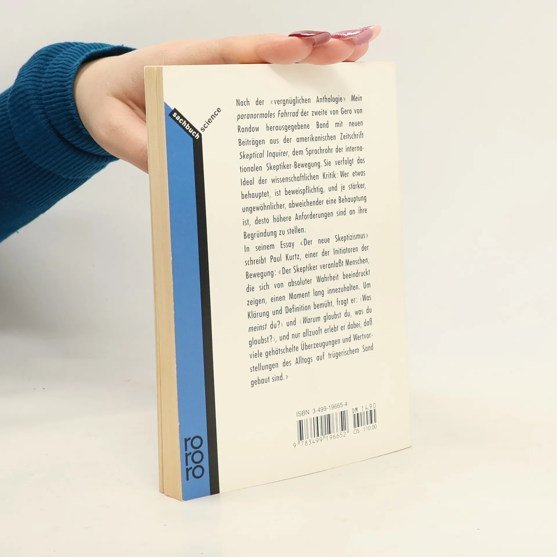 Nach der "vergnüglichen Anthologie" >Mein paranormales Fahrrad< der zweite von Gero von Randow herausgegebene Band mit neuen Beiträgen aus der amerikanischen Zeitschrift >Skeptical Inquirer<, dem Sprachrohr der internationalen Skeptiker-Bewegung. Sie verfolgt das Ideal der wissenschaftlichen Kritik: Wer etwas behauptet, ist beweispflichtig, und je stärker, ungewöhnlicher, abweichender eine Behauptung ist, desto höhere Anforderungen sind an ihre Begründung zu stellen.
