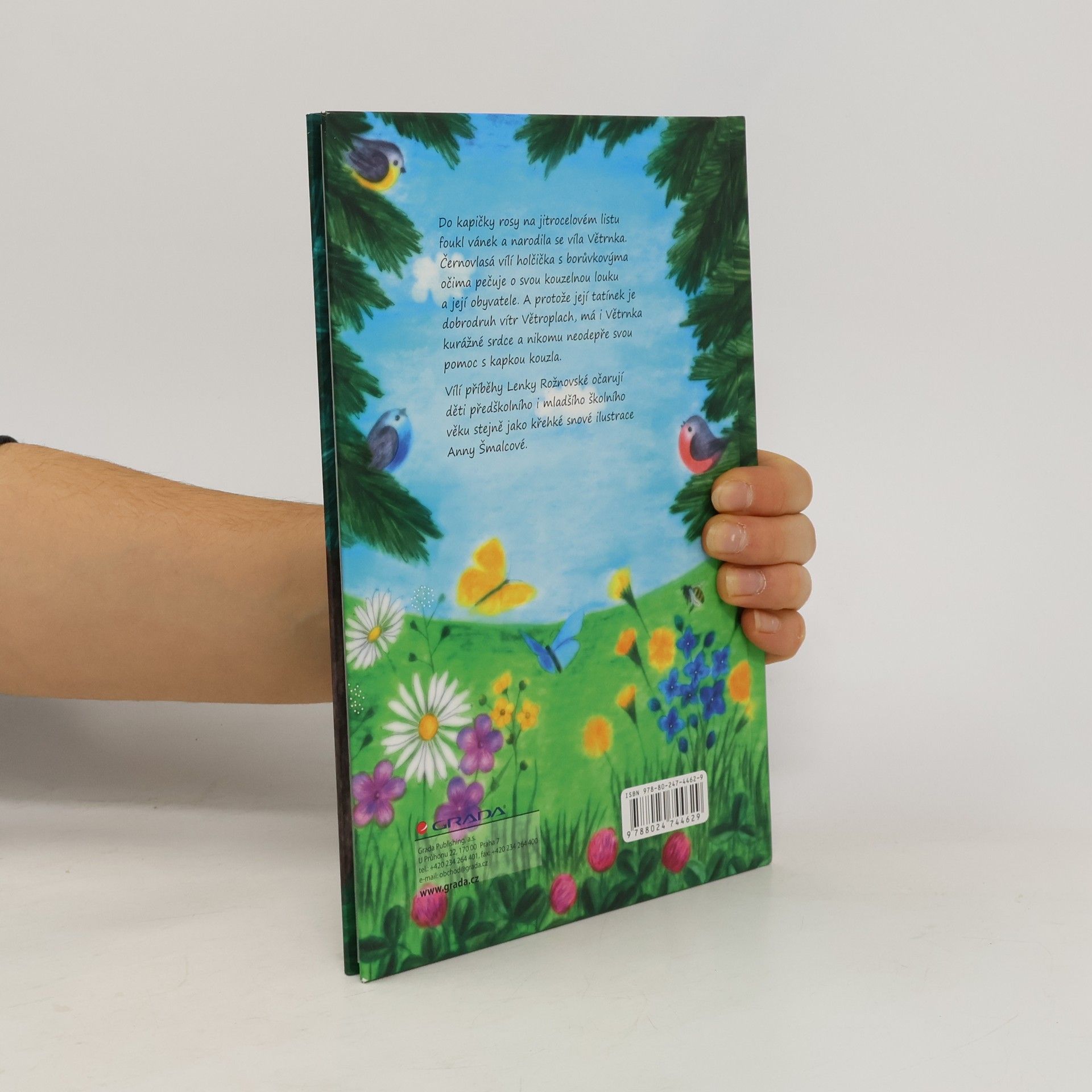 Do kapičky rosy na jitrocelovém listu foukl vánek a narodila se víla Větrnka. Černovlasá vílí holčička s borůvkovýma očima pečuje o svou kouzelnou louku a její obyvatele. A protože její tatínek je dobrodruh vítr Větroplach, má i Větrnka kurážné srdce a nikomu neodepře svou pomoc s kapkou kouzla. Vílí příběhy Lenky Rožnovské očarují děti předškolního i mladšího školního věku, stejně jako křehké snové ilustrace Anny Šmalcové.