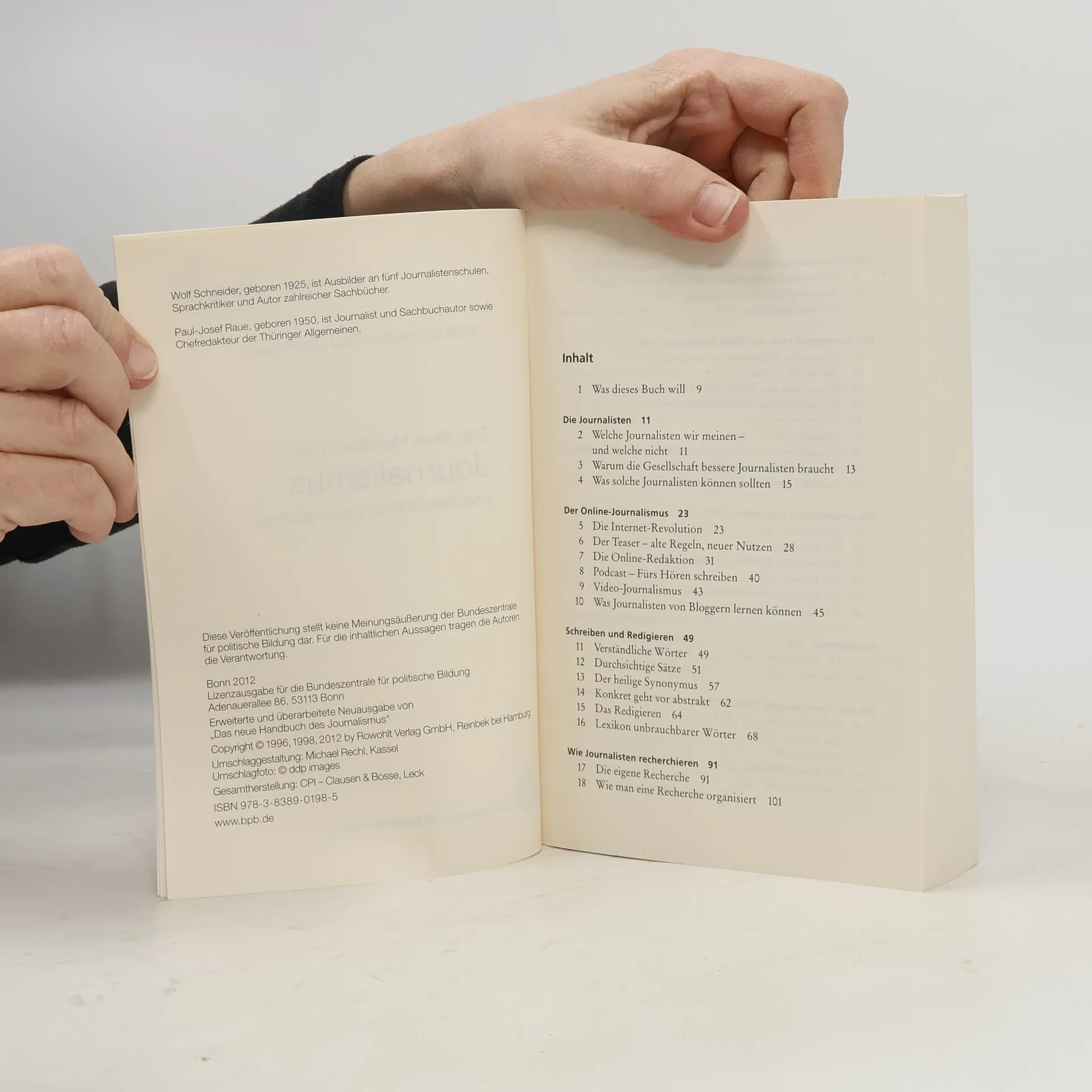Wolf Schneider, geboren am 07. Mai 1925 und gestorben am 11. November 2022, veröffentlichte zahlreiche Sachbücher, darunter bedeutende Werke zu Sprache, Stil und Journalismus. Er diente als Soldat von 1943 bis 1945, war Korrespondent der «Süddeutschen Zeitung» in Washington, Verlagsleiter des «Stern», Chefredakteur der «Welt», Moderator der «NDR-Talk-Show» und leitete 16 Jahre die Hamburger Journalistenschule. Für sein Lebenswerk erhielt er 2011 den Henri-Nannen-Preis und wurde 2012 vom «Medium Magazin» als Journalist des Jahres ausgezeichnet. Zuletzt erschienen bei Rowohlt «Der Soldat. Ein Nachruf» (2013) und «Denkt endlich an die Enkel! Eine letzte Warnung, bevor alles zu spät ist» (2019). Er lebte in Starnberg. Paul-Josef Raue, geboren am 13. Juni 1950 und gestorben am 11. März 2019, war Chefredakteur mehrerer Tageszeitungen, zuletzt bis 2015 bei der Thüringer Allgemeinen. Zuvor leitete er die Braunschweiger Zeitung, die Volksstimme (Magdeburg), die Frankfurter Neue Presse, die Oberhessische Presse (Marburg) sowie die Eisenacher Presse, die erste deutsch-deutsche Zeitung nach der Wende. Er war Mitbegründer des Wirtschaftsmagazins Econy (heute Brand Eins) und gewann mit seinen Redaktionen zahlreiche Journalistenpreise. Als Lehrer in der Aus- und Weiterbildung von Journalisten verfasste er zahlreiche Aufsätze zum Journalismus und lernte seinen Beruf im ersten Jahrgang der Hamburger Journalistenschule bei Wolf Schneider.
