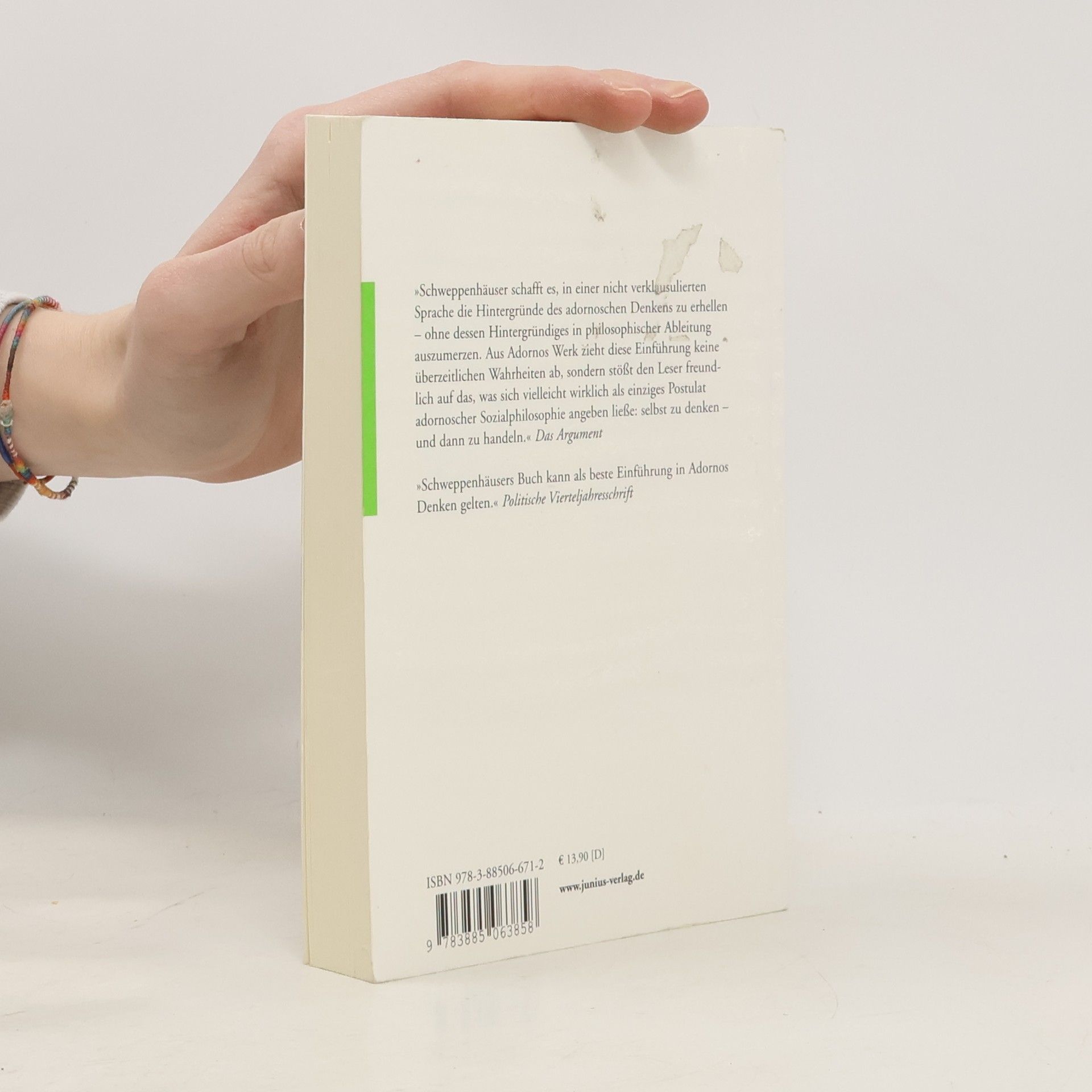 Der große Einfluss, den das Denken Theodor W. Adornos (1903–1969) auf die bundesrepublikanische und die internationale Philosophie ausgeübt hat, wird in dieser philosophischen Einführung in sein systemkritisches, aber keineswegs unsystematisches Denken nachgezeichnet. Die Bezugspunkte stammen aus den Minima Moralia und der Negativen Dialektik , neben Adornos Beitrag zur Dialektik der Aufklärung und der Philosophie der neuen Musik seine wichtigsten Werke. Von dort aus werden wesentliche Motive entwickelt, die das komplexe Gedankengebäude strukturieren. Von Adornos philosophischen Anfängen bis zu seiner Auseinandersetzung mit der »Kulturindustrie« werden die Fäden sichtbar, die die Arbeitsfelder des Philosophen, Soziologen, Kritikers und Komponisten verbinden.