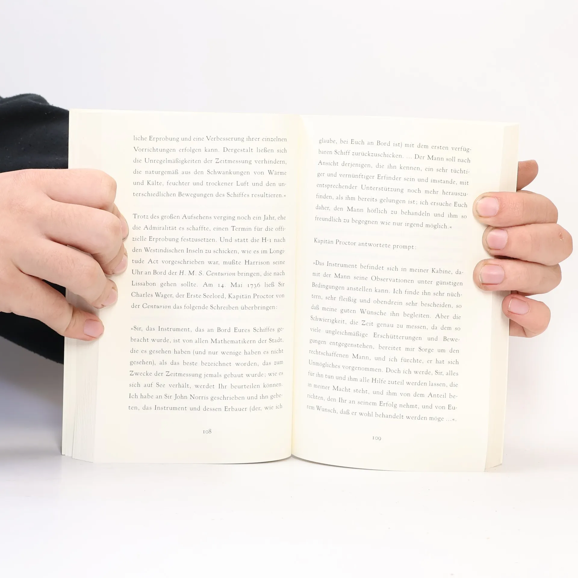 Jeder, der im achtzehnten Jahrhundert mit der Seefahrt zu tun hatte, wusste, dass die dornigste wissenschaftlichei Frage der Zeit "das Längengrad-Problem" war - ein Dilemma, das die Navigatoren seit Jahrhunderten quälte. Unfähig, den Längengrad ihrer Position festzustellen, waren die Seeleute im Zeitalter der grossen Entdeckungen praktisch auf vage Vermutungen angewiesen, sobald sie das Land aus den Augen verloren. Die meisten Wissenschaftler versuchten eine Antwort in den Sternen zu finden. Im Gegensatz dazu machte sich ein Mann, John Harrison, an die Arbeit, eine mechanische Lösung zu finden - einen Chronometer, der auf See präzise Zeitangaben zu machen vermochte.