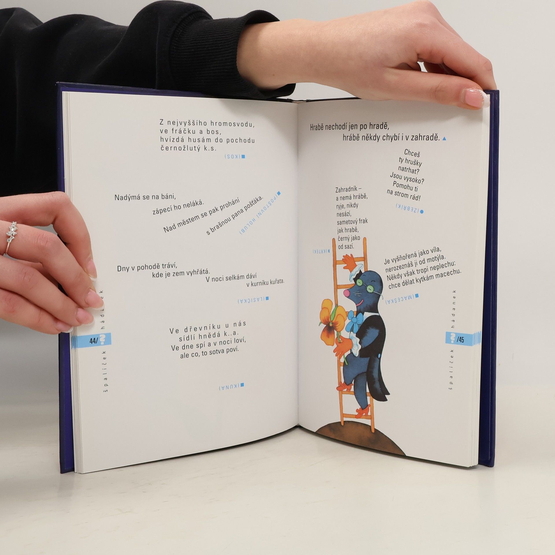 Hádanky jsou rozděleny do nejrůznějších oblastí např. hádanky o lidském těle, ze zahrádky, ze zoologické zahrady, hádanky o věcech, které jsou v domě apod. Některé hádanky jsou napsány ve formě jednoduchých kaligramů. Text je doplněn milými obrázky.