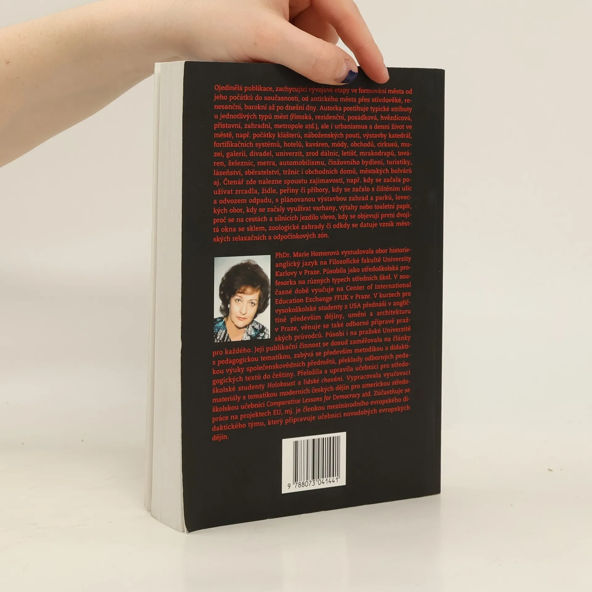 Ojedinělá publikace, zachycující vývojové etapy ve formování města od jeho počátků do současnosti, od antického města přes středověké, renesanční, barokní až po dnešní dny. Autorka postihuje typické atributy u jednotlivých typů měst (římská, rezidenční, posádková, hvězdicová, přístavní, zahradní, metropole atd.), ale i urbanismus a denní život ve městě, např. počátky klášterů, náboženských poutí, výstavby katedrál, fortifikačních systémů, hotelů, kaváren, módy, obchodů, cirkusů, muzeí, galerií, divadel, univerzit, zrod dálnic, letišť, mrakodrapů, továren, železnic, metra, automobilismu, činžovního bydlení, horolezectví, lázeňství, sběratelství, tržnic i obchodních domů, městských bulvárů aj. Čtenář zde nalezne spoustu zajímavostí, např. kdy se začala používat zrcadla, židle, peřiny či příbory, kdy se začalo s čištěním ulic a odvozem odpadu, s plánovanou výstavbou zahrad a parků, loveckých obor, kdy se začaly využívat varhany, výtahy nebo toaletní papír, proč se na cestách a silnicích jezdilo vlevo, kdy se objevují první dvojitá okna se sklem, zoologické zahrady či odkdy se datuje vznik městských relaxačních a odpočinkových zón.