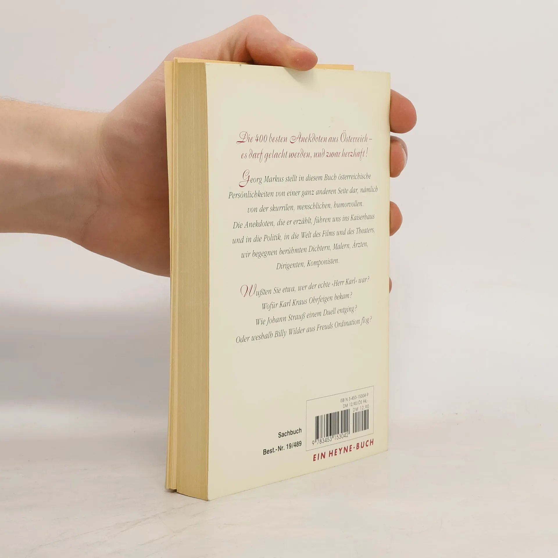 Georg Markus erzählt die 400 besten Anekdoten aus der Welt des Films und des Theaters, aus dem Kaiserhaus und aus der Politik, von Dichtern, Malern, Ärzten, Dirigenten, Komponisten. Ein Buch, bei dessen Lektüre auf jeder einzelnen Seite herzhaft gelacht werden kann.Kaiser Franz Josephs erste Autofahrt, wie Johann Strauß einem Duell entging, als Hans Moser nicht nuscheln konnte, Wie ein Erzbischof zu sechs Kindern kam, Einbrecher in Karajans Villa, von einem Bettler, der sich Verdis Schüler nannte, wofür Karl Kraus Ohrfeigen bekam, weshalb Billy Wilder aus Freuds Ordination flog, wer der echte "Herr Karl" war u.v.m.