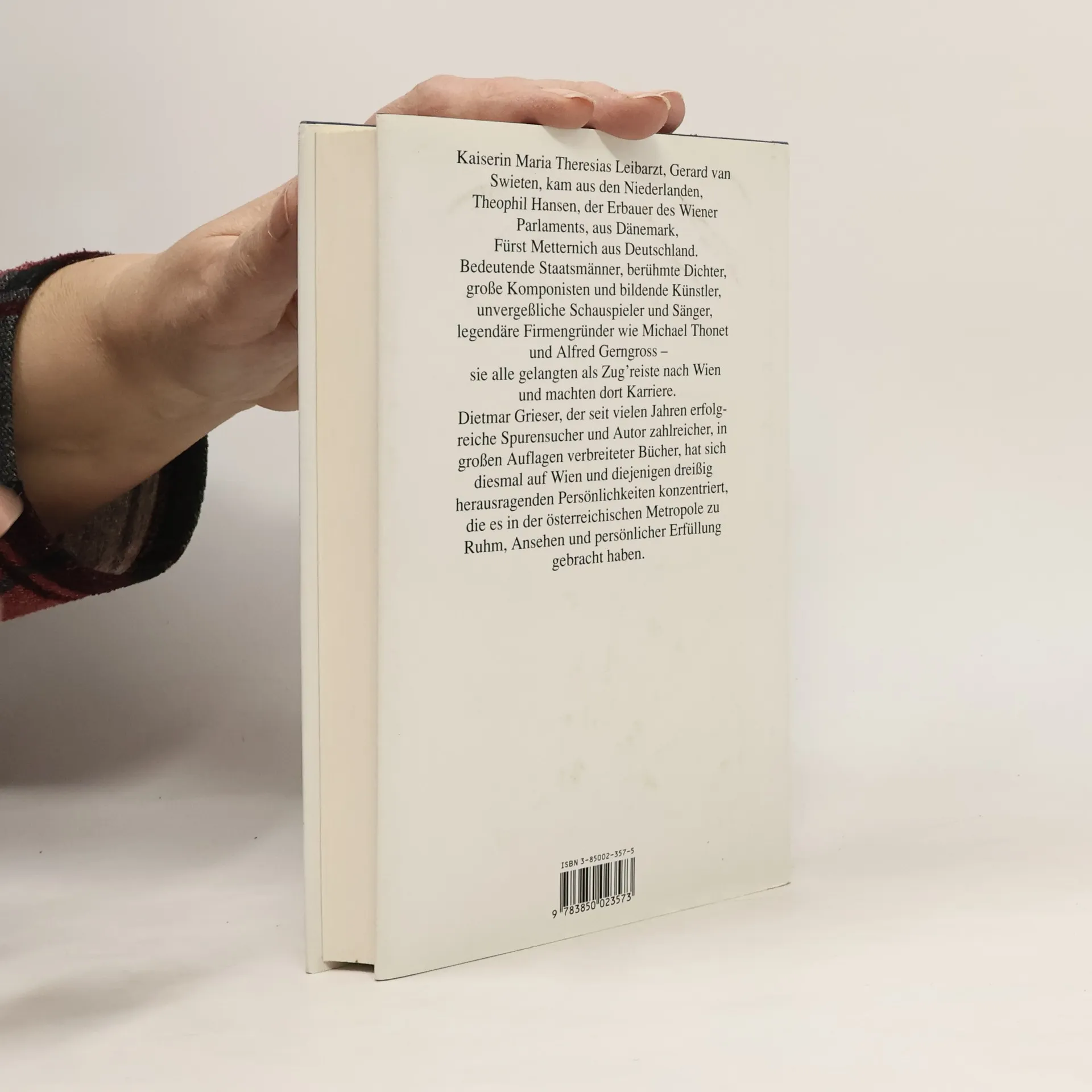 Behandelte Persönlichkeiten:§Prinz Eugen von Savoyen, Clemens Lothar Wenzel von Metternich, Ottilie von Goethe, Friedrich Hebbel, Ludwig Speidel, Alja Rachmanowa, Heinrich Laube, Charlotte Wolter, Adele Sandrock, Rosa Albach-Retty, Raoul Aslan, Leo Slezak, Lotte Lehmann, Michiko Tanaka-Meinl, Antonio Salieri, Ludwig van Beethoven, Johannes Brahms, Anton Dominik Fernkorn, Friedrich von Schmidt, Theophil Hansen, Michael Thonet, Gerard van Swieten, Theodor Billroth, Alfred Gerngross, Angelo Soliman, Jean Baptiste Clery, Fanny von Arnstein, Mitsuko Aoyama, Basilio Calafati, Nikolai Basilowitsch Kobelkoff
