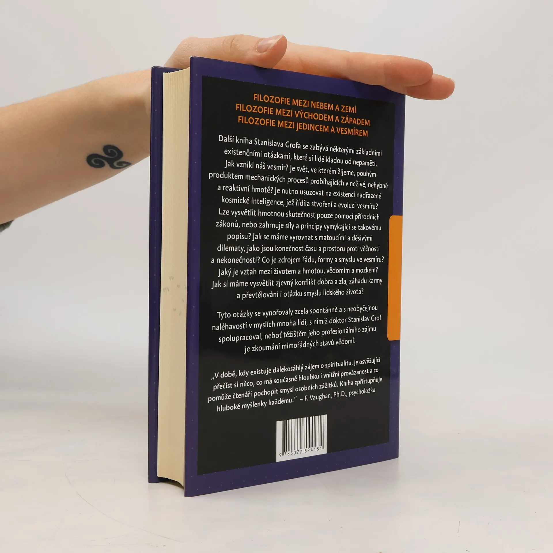 Filozofie mezi nebem a zemí Filozofie mezi východem a západem Filozofie mezi jedincem a vesmírem Otázky, které trápí každého přemýšlivého člověka Tato Grofova kniha se zabývá některými základními existenčními otázkami, které si lidé kladou od nepaměti. Jak vznikl náš vesmír? Je svět, ve kterém žijeme, pouhým produktem mechanických procesů probíhajících v neživé, nehybné a reaktivní hmotě? Je nutno usuzovat na existenci nadřazené kosmické inteligence, jež řídila stvoření a evoluci vesmíru? Lze vysvětlit hmotnou skutečnost pouze pomocí přírodních zákonů, nebo zahrnuje síly a principy vymykající se takovému popisu? Jak se máme vyrovnat s matoucími a děsivými dilematy, jako jsou konečnost času a prostoru proti věčnosti a nekonečnosti? Co je zdrojem řádu, formy a smyslu ve vesmíru? Jaký je vztah mezi životem a hmotou, vědomím a mozkem? Jak si máme vysvětlit zjevný konflikt dobra a zla, záhadu karmy a převtělování i otázku smyslu lidského života? Mnohé otázky, které autor v této knize zkoumá, mají velký význam pro běžný život. Tyto otázky se vynořovaly při autorově psychiatrické práci zcela spontánně a s neobyčejnou naléhavostí v myslích mnoha lidí, s nimiž spolupracoval. Příčinou je neobvyklá oblast studia, jež byla hlavním těžištěm Grofova zájmu po dobu čtyřiceti let jeho profesionálního života - totiž zkoumání mimořádných stavů vědomí.