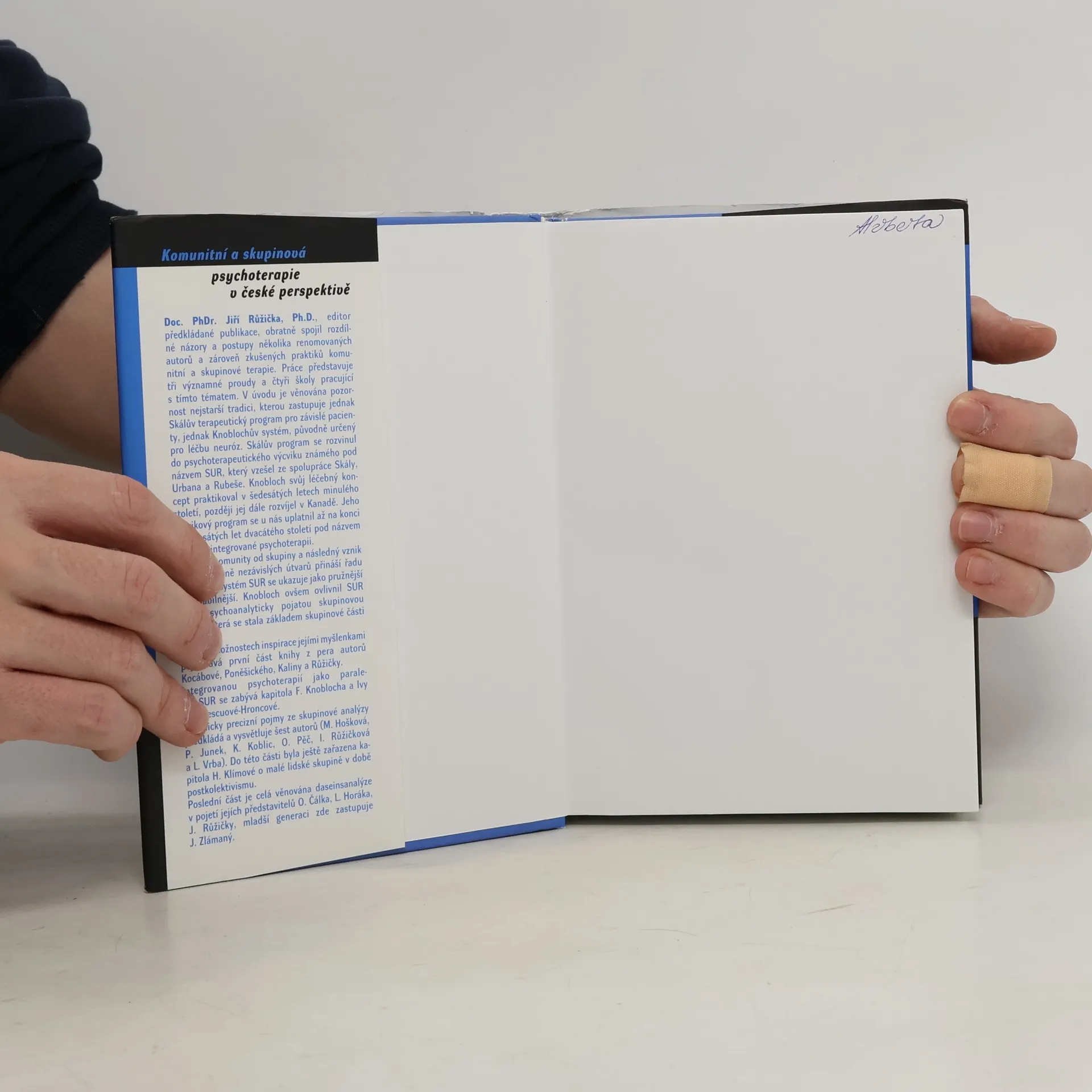 Doc. PhDr. Jiří Růžička, Ph.D., editor této publikace, spojil názory a postupy renomovaných autorů a praktiků komunitní a skupinové terapie. Práce představuje tři významné proudy a čtyři školy zaměřené na toto téma. Úvod se věnuje nejstarší tradici, zastoupené Skálovým terapeutickým programem pro závislé a Knoblochovým systémem pro léčbu neuróz. Skálův program se vyvinul do psychoterapeutického výcviku SUR, který vznikl spoluprací Skály, Urbana a Rubeše. Knobloch svůj koncept praktikoval v šedesátých letech a později ho rozvíjel v Kanadě, přičemž jeho výcvikový program se uplatnil v devadesátých letech pod názvem Výcvik v integrované psychoterapii. Oddělení komunity od skupiny vedlo k vzniku dvou relativně nezávislých útvarů, přičemž SUR se ukazuje jako pružnější a variabilnější. Knobloch ovlivnil SUR svou psychoanalyticky pojatou skupinovou terapií, která se stala základem skupinové části výcviku. První část knihy, autorů Kocábové, Poněšického, Kaliny a Růžičky, se zaměřuje na SUR a inspiraci jejími myšlenkami. Kapitola F. Knoblocha a Ivy Enachescuové-Hroncové se věnuje integrované psychoterapii jako paralelnímu přístupu. Technické pojmy ze skupinové analýzy vysvětluje šest autorů, zatímco kapitola H. Klímové se zabývá malou lidskou skupinou v postkolektivismu. Poslední část se věnuje daseinsanalýze podle O. Čálka, L. Horáka, J. Růžičky a J. Zlámaného.