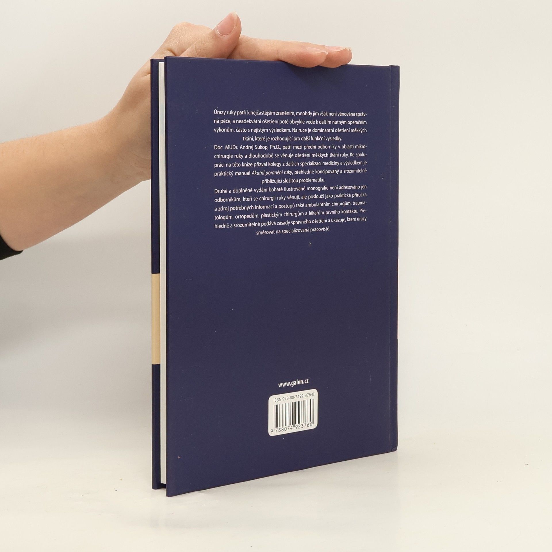 Úrazy ruky patří k nejčastějším zraněním, mnohdy jim však není věnována správná péče, a neadekvátní ošetření poté obvykle vede k dalším nutným operačním výkonům, často s nejistým výsledkem. Na ruce je dominantní ošetření měkkých tkání, které je rozhodující pro další funkční výsledky. Doc. MUDr. Andrej Sukop, Ph.D., patří mezi přední odborníky v oblasti mikrochirurgie ruky a dlouhodobě se věnuje ošetření měkkých tkání ruky. Ke spolupráci na této knize přizval kolegy z dalších specializací medicíny a výsledkem je praktický manuál Akutní poranění ruky, přehledně koncipovaný a srozumitelně přibližující složitou problematiku. Druhé a doplněné vydání bohatě ilustrované monografie není adresováno jen odborníkům, kteří se chirurgii ruky věnují, ale poslouží jako praktická příručka a zdroj potřebných informací a postupů také ambulantním chirurgům, traumatologům, ortopedům, plastickým chirurgům a lékařům prvního kontaktu. Přehledně a srozumitelně podává zásady správného ošetření a ukazuje, které úrazy směrovat na specializovaná pracoviště.