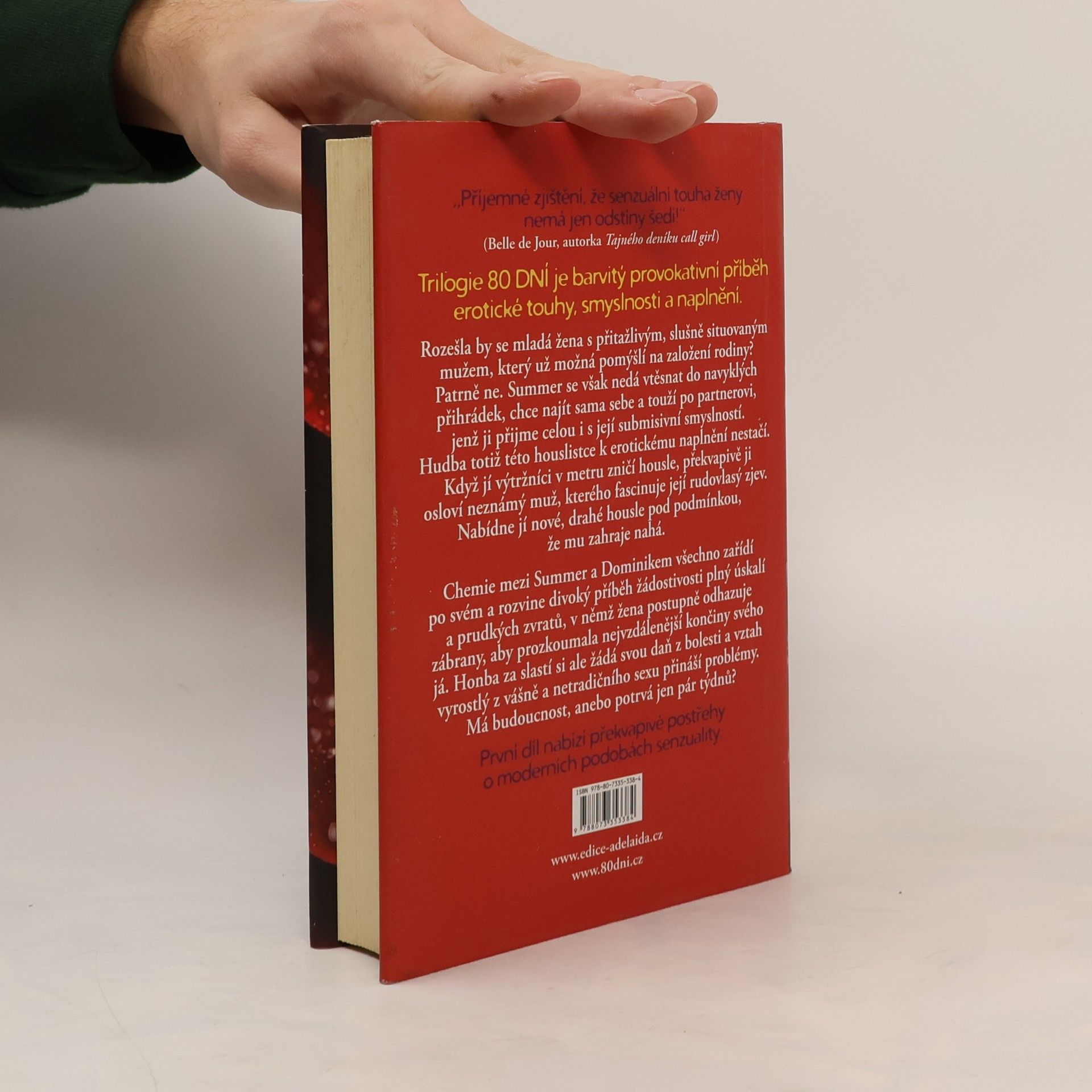 Trilogie 80 DNÍ je barvitý provokativní příběh erotické touhy, smyslnosti a naplnění. Rozešla by se mladá žena s přitažlivým, slušně situovaným mužem, který už možná pomýšlí na založení rodiny? Patrně ne. Summer se však nedá vtěsnat do navyklých přihrádek, chce najít sama sebe a touží po partnerovi, jenž ji přijme celou i s její submisivní smyslností. Hudba totiž této houslistce k erotickému naplnění nestačí. Když jí výtržníci v metru zničí housle, překvapivě ji osloví neznámý muž, kterého fascinuje její rudovlasý zjev. Nabídne jí nové, drahé housle pod podmínkou, že mu zahraje nahá. Chemie mezi Summer a Dominikem všechno zařídí po svém a rozvine divoký příběh žádostivosti plný úskalí a prudkých zvratů, v němž žena postupně odhazuje zábrany, aby prozkoumala nejvzdálenější končiny svého já. Honba za slastí si ale žádá svou daň z bolesti a vztah vyrostlý z vášně a netradičního sexu přináší problémy. Má budoucnost, anebo potrvá jen pár týdnů?