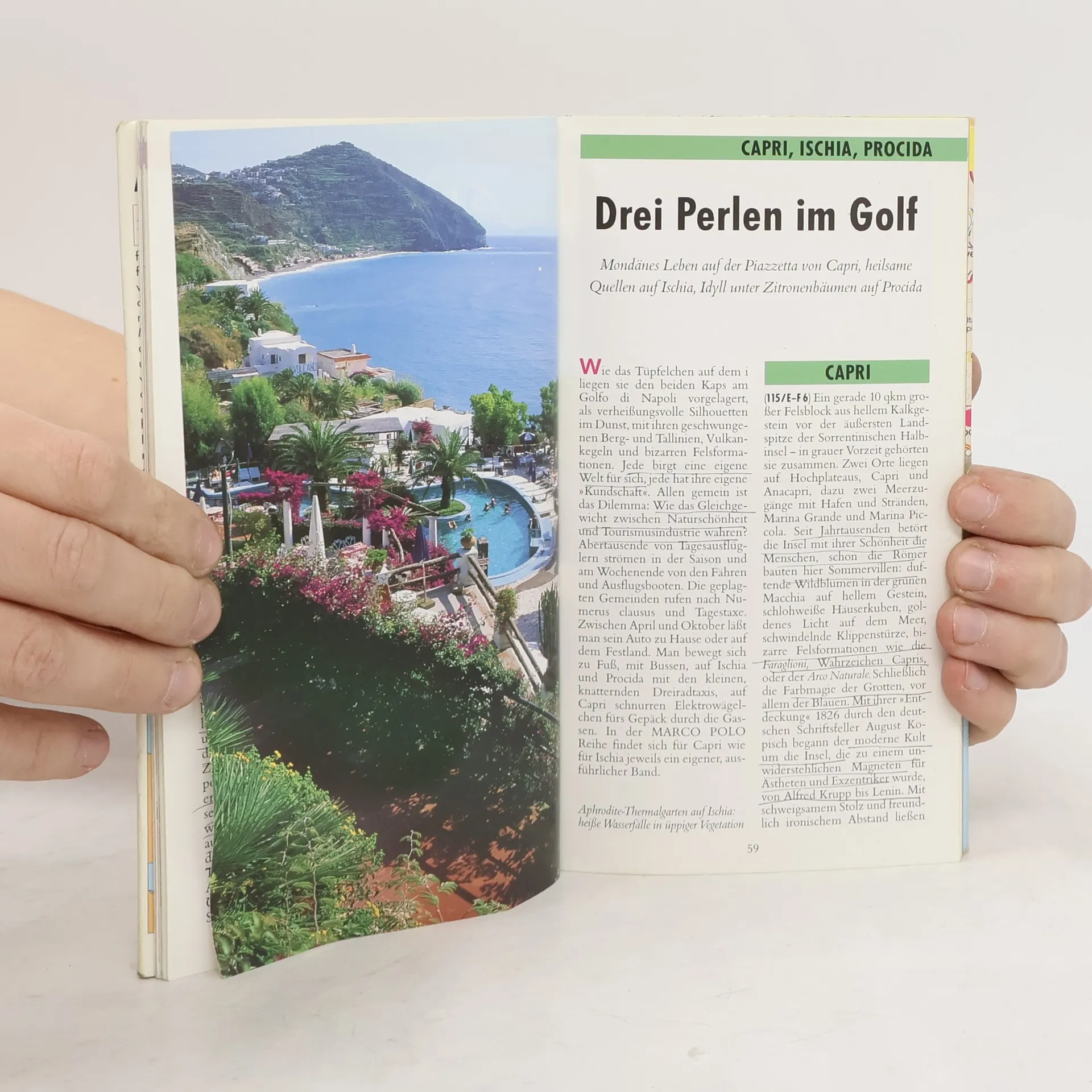 Der Golf von Neapel, ein unergründliches Paradies: Aus den dunklen Zitrushainen von Sorrent und Amalfi blitzen gelbe Zitronen auf, weiße Blüten duften betörend. In tiefen Grotten längs der Felsküste leuchtet das Meer kobaltblau und smaragdgrün. Vor dem Hintergrund des Vulkans Vesuv zeigen in der Ruinenstadt Pompeji „Kamasutra“-Fresken, wie die alten Römer liebten. In Neapel stößt man nach engen Gassen auf bunte, üppige Märtke, schlendert über weite, elegante Plätze oder steigt hinab in die unterirdische Stadt im Tuff. Abends lässt man sich die beste Pizza der Welt schmecken, und im Sommer geht es zum Surfen nach Palinuro.