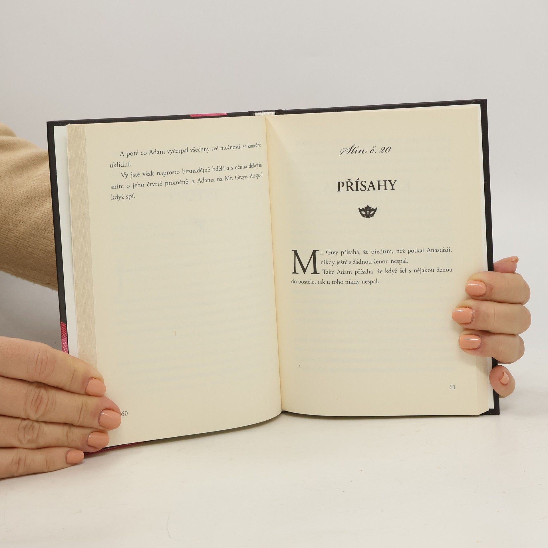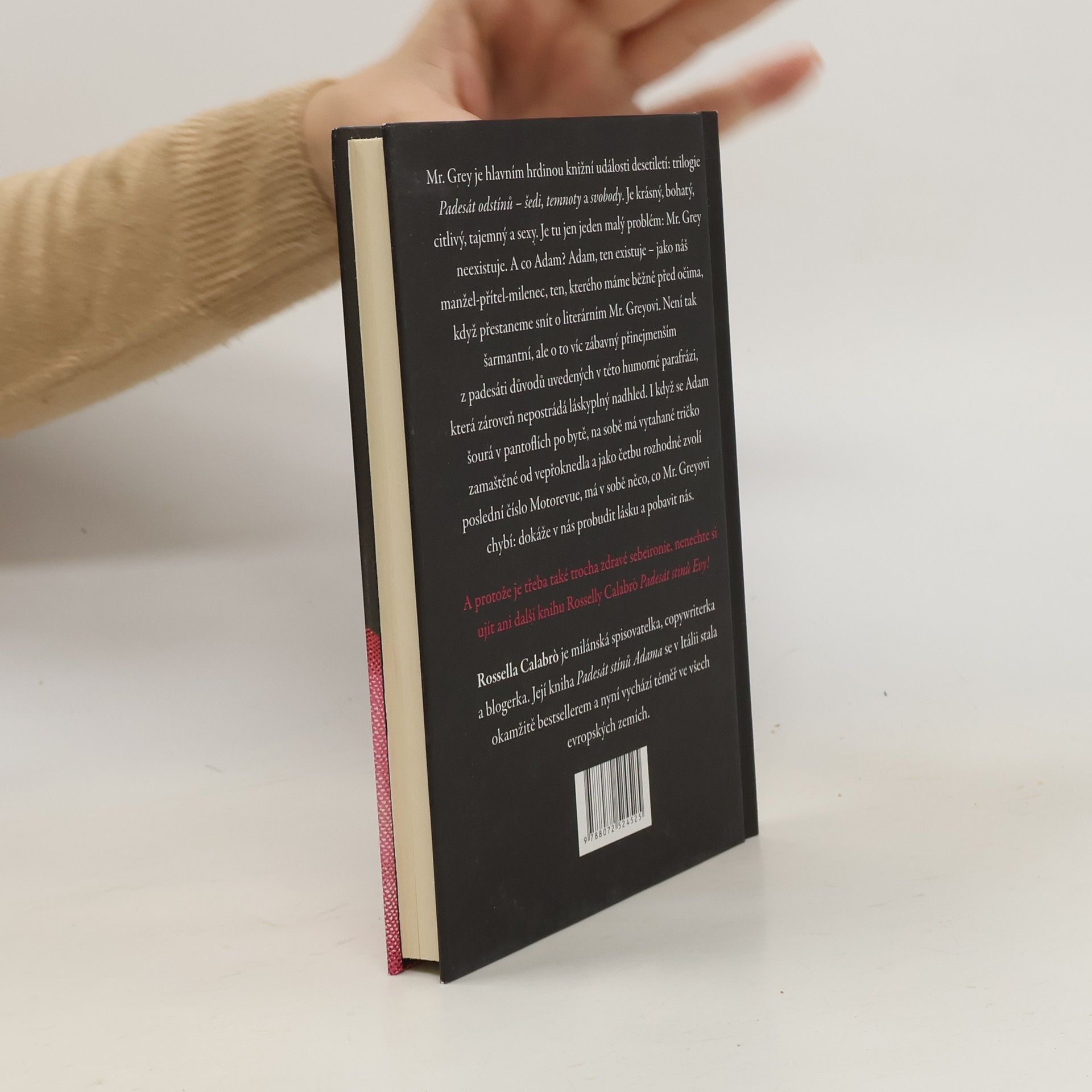 Mr. Grey je krásný, bohatý, citlivý, tajemný a sexy. Zato Adam představuje našeho manžela, milence, přítele... Tato humorná parafráze však nepostrádá láskyplný nadhled. Mr. Grey je krásný, bohatý, citlivý, tajemný a sexy. Je hlavním hrdinou knižní události desetiletí: trilogie Padesát odstínů - šedi, temnoty a svobody. Je tu jen jeden malý problém: Mr. Grey neexistuje. A co Adam? Adam ten existuje. Když Mr. Grey zdvořile konverzuje se svou milovanou, Adam předříká celou abecedu krkáním. Když se Mr. Grey chopí velení, Adam uchopí televizní ovladač. Když Mr. Grey preluduje srdcervoucí tóny na klavíru, našinec Adam se láskyplně dloube v nose na gauči. Adam je prostě náš manžel-přítel-milenec, ten, kterého máme běžně před očima, když přestaneme snít o literárním Mr. Greyovi. Není tak šaramantní, ale o to víc zábavný alespoň z padesáti důvodů, uvedených v této veselé knížce. Protože, i když se Adam šourá v pantoflích po bytě a na sobě má vytahané tričko zamaštěné od vepřoknedla a jako četbu rozhodně zvolí poslední číslo Motorevue, má v sobě něco, co Mr. Greyovi chybí: dokáže v nás probudit lásku a pobavit nás. Takže poté, co jsme jedním dechem přečetly celou trilogii E. L. Jamesové, jsme si položily otázku, kdo že je ten mužský exemplář, který hlasitě chrápe po našem boku? Tato kniha nám to pomůže odhalit a hlavně nás pobaví, protože nakonec smích je všeobecně tou nejerotičtější pomůckou.