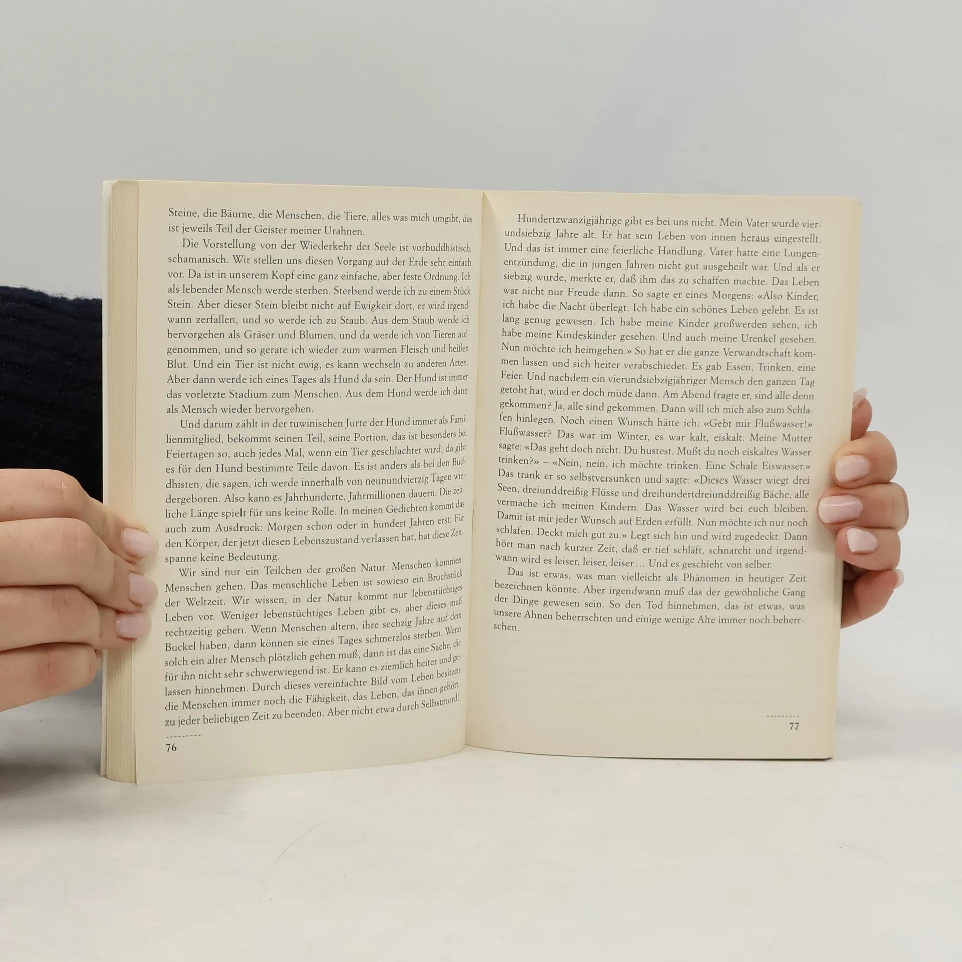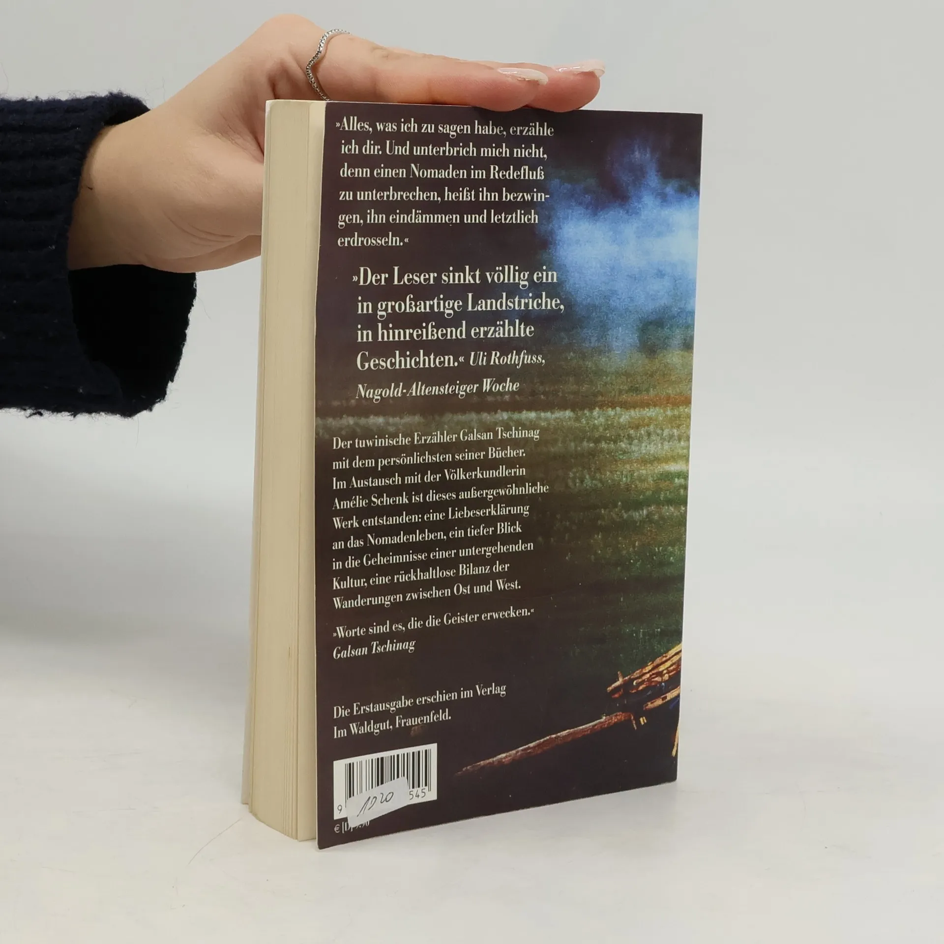 Zwei anerkannte Fachleute aus dem Osten und aus dem Westen tun sich zusammen, um über die Welt der Nomaden zu erzählen. Die Ethnologin Amélie Schenk und Galsan Tschinag, das Stammesoberhaupt der Tuwa, berichten in einem Zwiegespräch über Leben, Krankheit, Tod, über das Heranwachsen der Kinder, über das Schamanentum. Sie geben dem Leser Einblick in die Lebensweise und Gedankenwelt der Tuwa und zeichnen ein vielschichtiges Bild der nomadischen Kultur. Eine Liebeserklärung an das Nomadenleben, ein tiefer Blick in die Geheimnisse einer untergehenden Kultur, eine rückhaltlose Bilanz der Wanderungen zwischen Ost und West.