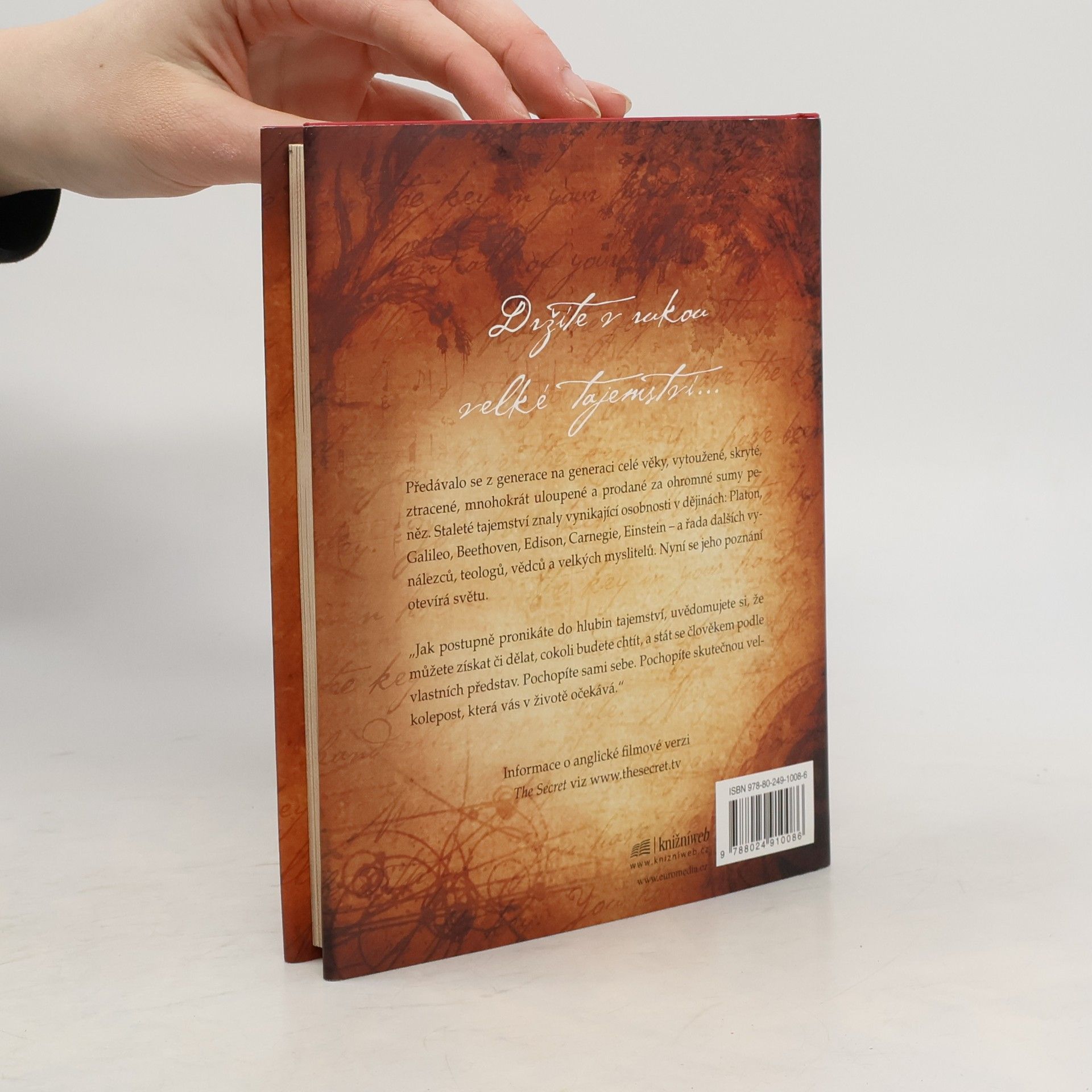 Stojíte na prahu poznání. Fragmenty velkého tajemství se objevují v legendách, mýtech a filozofiích po celá staletí, jen znát tu správnou šifru. Kniha, kterou právě držíte v rukou, shromáždila moudrost předchozích generací a naučí vás dosáhnout všeho, co si přejete - v oblasti peněz, zdraví, vztahů i osobního štěstí. Pochopíte skryté síly, které ve vás dřímají, a odhalíte jejich moc. Učení novodobých mistrů, kteří štěstí, zdraví a bohatství dosáhli, vám ukáže, jak lze tajemství spokojeného života aplikovat na každém kroku.