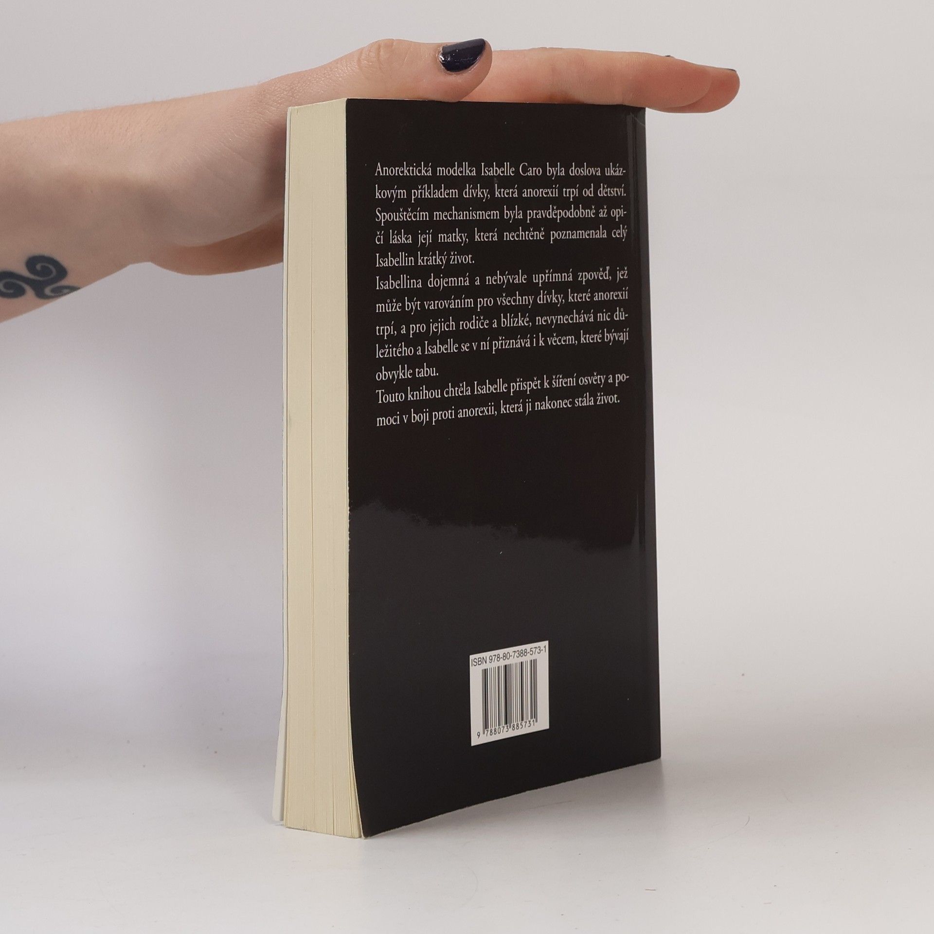 Její fotky obletěly celý svět, aby pomohly v boji s mentální anorexií. Isabelle Caro - modelka trpící touto nemocí pózovala na šokujících fotografiích Oliviera Toscaniho. Rozhodla se světu ukázat své tělo. Vyhublé až na kost, nahé… Její odvaha odhalit se rozdělila svět. Někteří ji i celou kampaň proti poruše příjmu potravy ocenili, jiní fotografie šmahem odsoudili a kampaň označili za příliš krutou. Nakonec se rozhodla svůj příběh sepsat. Příběh, kam až tato nemoc může zajít. Dva roky po jejím vydání modelka Isabelle Caro svůj boj prohrála. Zemřela ve věku 28 let.
