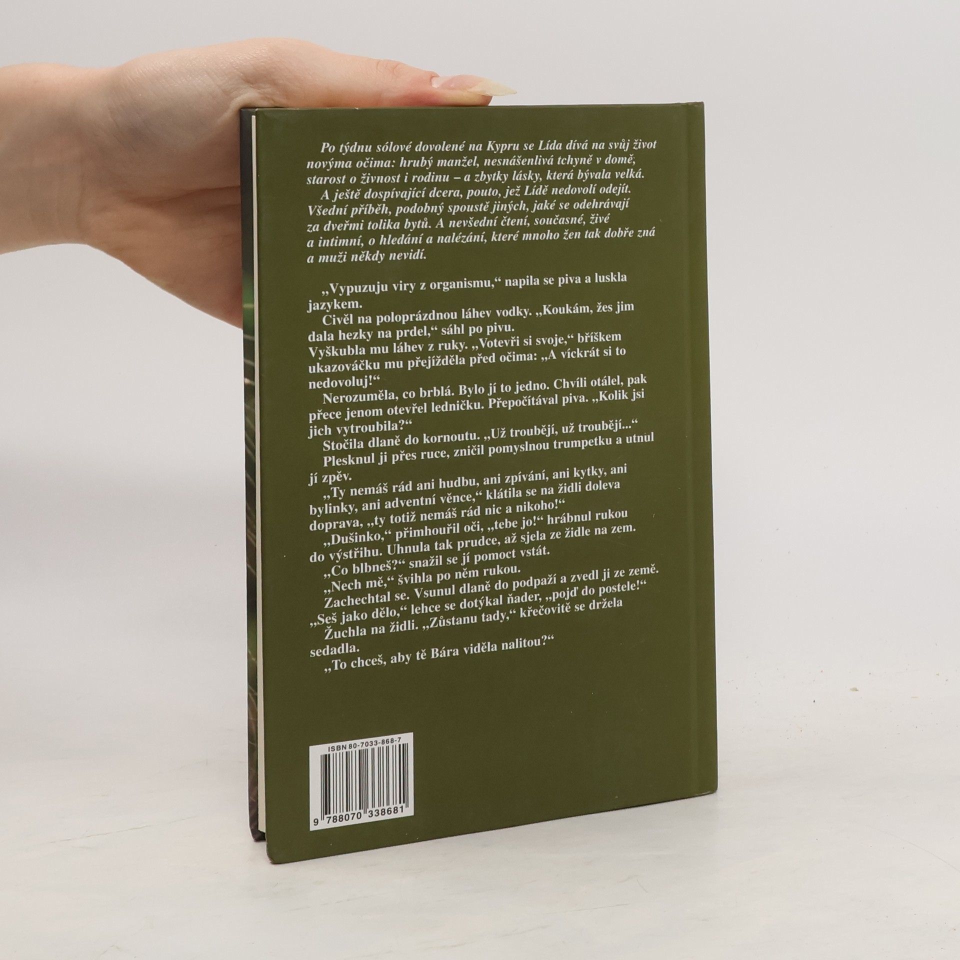 Po týdnu sólové dovolené na Kypru vnímá hlavní hrdinka nového románu známé české spisovatelky novýma očima svůj život. Vidí jen hrubého manžela, nesnesitelnou tchyni, starosti o živnost i rodinu - a zbytky lásky, která bývala veliká. A ještě dospívající dceru, pouto, jež Lídě nedovolí odejít. Příběh současné ženy nabízí nevšední čtenářský prožitek - intimní zpověď o hledání a nalézání, které mnoho žen tak dobře zná a muži málokdy vidí.