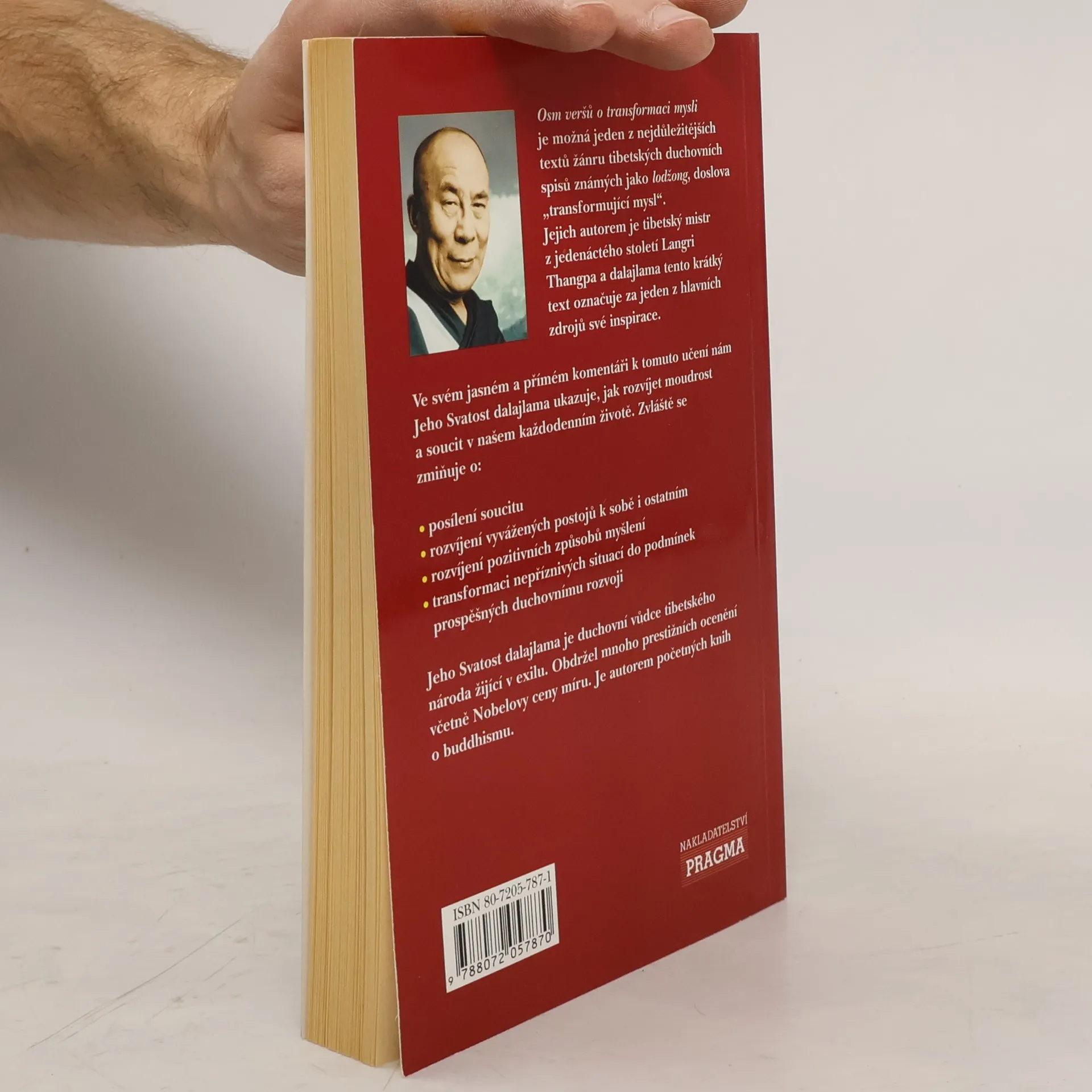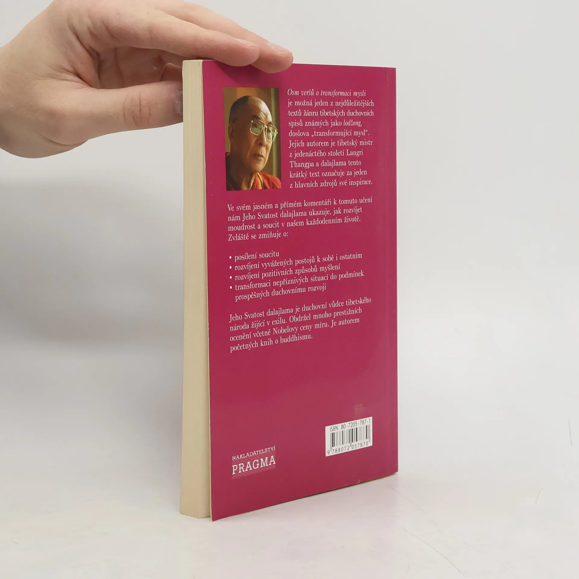 Osm veršů o vyvíjení a transformaci vašeho života. Jeden z nejdůležitějších textů žánru tibetských duchovních spisů známých jako lodžong. Jejich autorem je tibetský mistr z jedenáctého století Langri Thangpa a dalajlama tento krátký text označuje za jeden z hlavních zdrojů své inspirace. Ve svém jasném a přímém komentáři k tomuto učení nám Jeho Svatost dalajlama ukazuje, jak rozvíjet moudrost a soucit v každodenním životě.