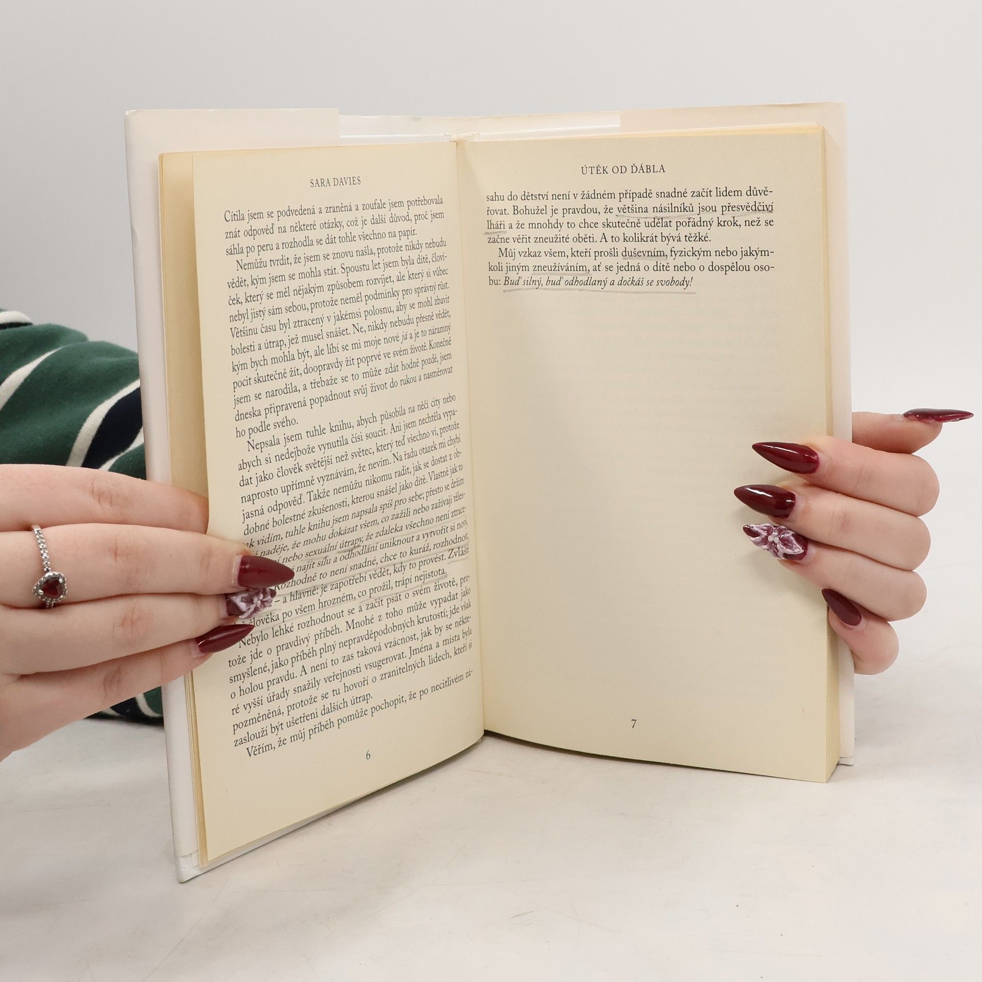 Skutečný příběh o cestě mladé ženy ze začarovaného kruhu násilí a krutosti. Sara Davies prožila celé své dětství ve strachu. Poznala teror, jaký si žádné dítě nedokáže ani představit. Ještě jako malé dívce jí otec ukradl dětství, když ji poprvé znásilnil. Pro Saru tak začaly roky plné teroru a násilí. Nakonec v sobě našla dost síly a se vším se svěřila matce. Třebaže byl její otec nakonec zatčen a uvězněn, Saře trvalo ještě dlouho, než se zbavila špatných vzpomínek, které ji neustále pronásledovaly. Ve snaze najít lásku a oporu, které nikdy nepoznala, navazovala vztahy s mnoha muži, což končilo potraty, násilím a hrubostí. Její rozhodnutí být sama sebou a nalézt nezávislost ji přivedlo k odchodu z domova a práci pro modelingovou agenturu. Poslední zbytky iluzí ztratila po zjištění, že její zaměstnavatelé, jimž plně důvěřovala, ji pouze klamou a zneužívají. Podaří se Saře uniknout z tohoto začarovaného kruhu a zbavit se minulosti?