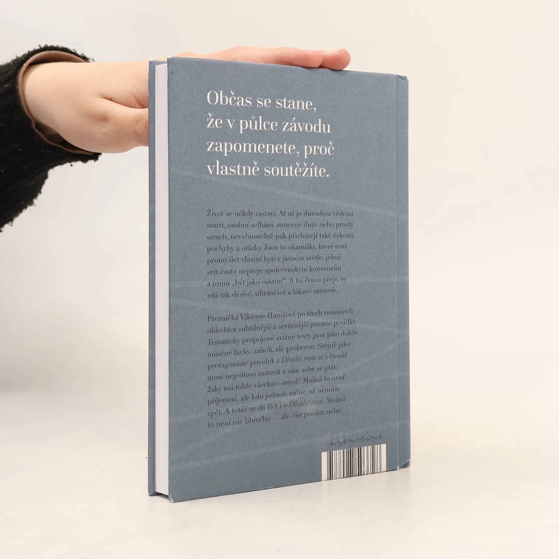 Sbírka povídek s tématem sebevraždy. Život se někdy zastaví. Ať už je to vědomí smrti, osobní selhání, ztracené iluze, nebo prostý strach, nevyhnutelně s nimi přicházejí také úzkosti, pochyby a otázky. Jsou to okamžiky, které nutí promýšlet vlastní bytí v jasném světle, jehož svit často nepřeje společenským konvencím a tomu „být jako ostatní“. A to, čemu přeje, se zdá být tak děsivé, uhrančivé a lákavé zároveň… Prozaička Viktorie Hanišová po třech románech ohledává subtilnější a sevřenější prostor povídky. Tematicky propojené svižné texty jsou jako dobře míněné facky: zabolí, ale proberou. Stejně jako protagonisté povídek z Dlouhé tratě se i čtenář musí nejednou zastavit a sám sebe se ptát: Jaký má tohle všechno smysl? Možná to není příjemné pomyšlení, ale kdo jednou začne, už nemůže zpět. A to samé se dá říct i o Dlouhé trati. Možná to není nic líbivého — ale číst přestat nelze.