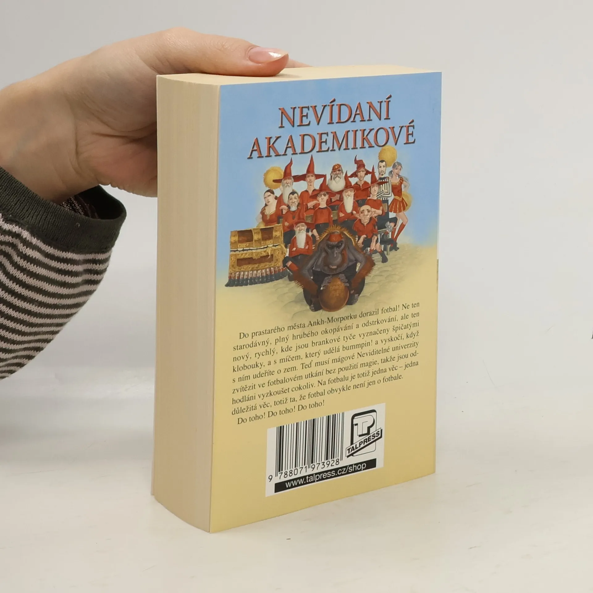 Do prastarého města Ankh-Morporku dorazil fotbal! Ne ten starodávný, plný hrubého okopávání a odstrkování, ale ten nový, rychlý, kde jsou brankové tyče vyznačeny špičatými klobouky, a s míčem, který udělá bummpin! a vyskočí, když s ním udeříte o zem. Teď musí mágové Neviditelné univerzity zvítězit ve fotbalovém utkání bez použití magie, takže jsou odhodláni vyzkoušet cokoliv. Na fotbalu je totiž jedna věc – jedna důležitá věc, totiž ta, že fotbal obvykle není jen o fotbale. Láska! Góly! Móda! Dvanáct pint Hlemýžďova Starého výstředníka! To vše v nejnovějším díle Úžasné Zeměplochy!