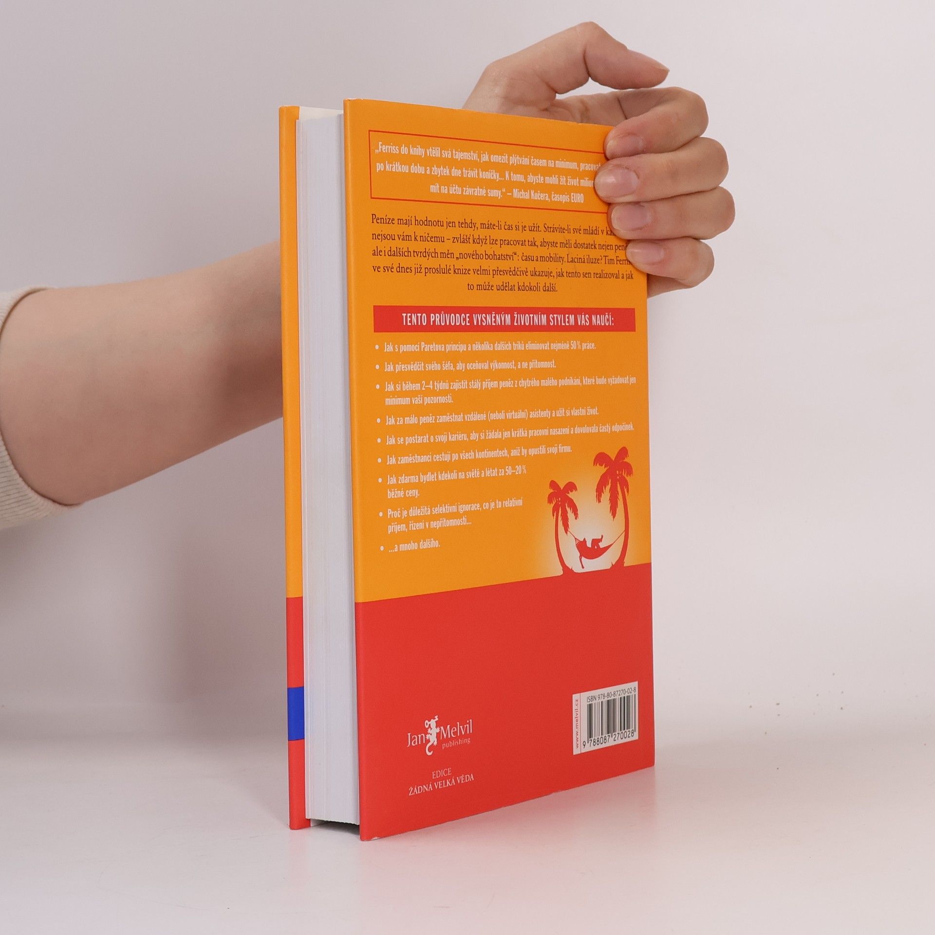 Peníze mají hodnotu jen tehdy, máte-li čas si je užít. Strávíte-li své mládí v kanceláři, nejsou vám k ničemu zvlášť když lze pracovat tak, abyste měli dostatek nejen peněz, ale i dalších tvrdých měn nového bohatství: času a mobility. Laciná iluze? Tim Ferriss ve své dnes již proslulé knize velmi přesvědčivě ukazuje, jak tento sen realizoval a jak to může udělat kdokoli další. Kniha je světovým bestsellerem a vyšla v 35 zemích.