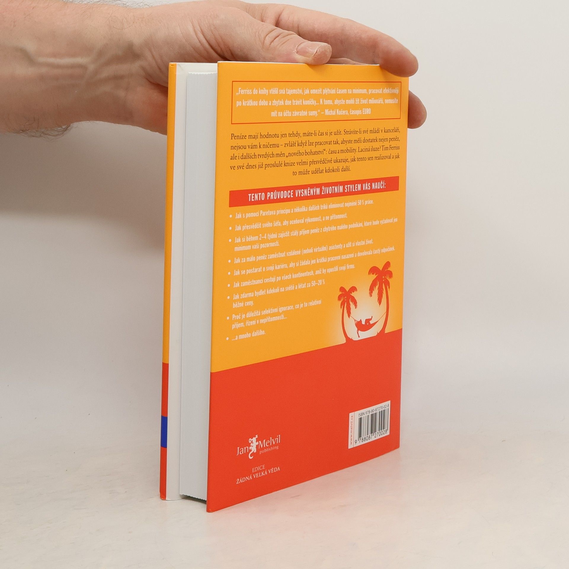 Peníze mají hodnotu jen tehdy, máte-li čas si je užít. Strávíte-li své mládí v kanceláři, nejsou vám k ničemu zvlášť když lze pracovat tak, abyste měli dostatek nejen peněz, ale i dalších tvrdých měn nového bohatství: času a mobility. Laciná iluze? Tim Ferriss ve své dnes již proslulé knize velmi přesvědčivě ukazuje, jak tento sen realizoval a jak to může udělat kdokoli další. Kniha je světovým bestsellerem a vyšla v 35 zemích.