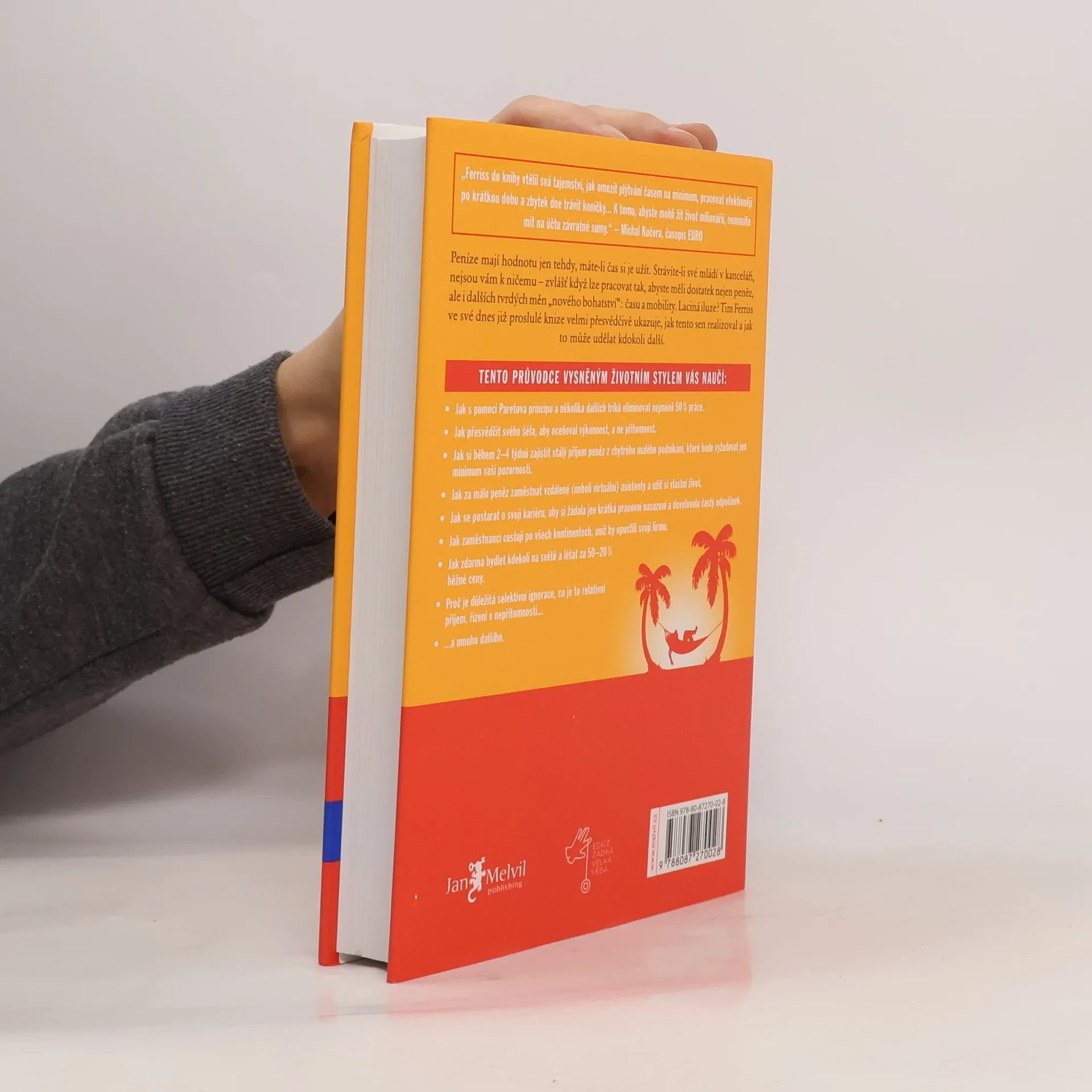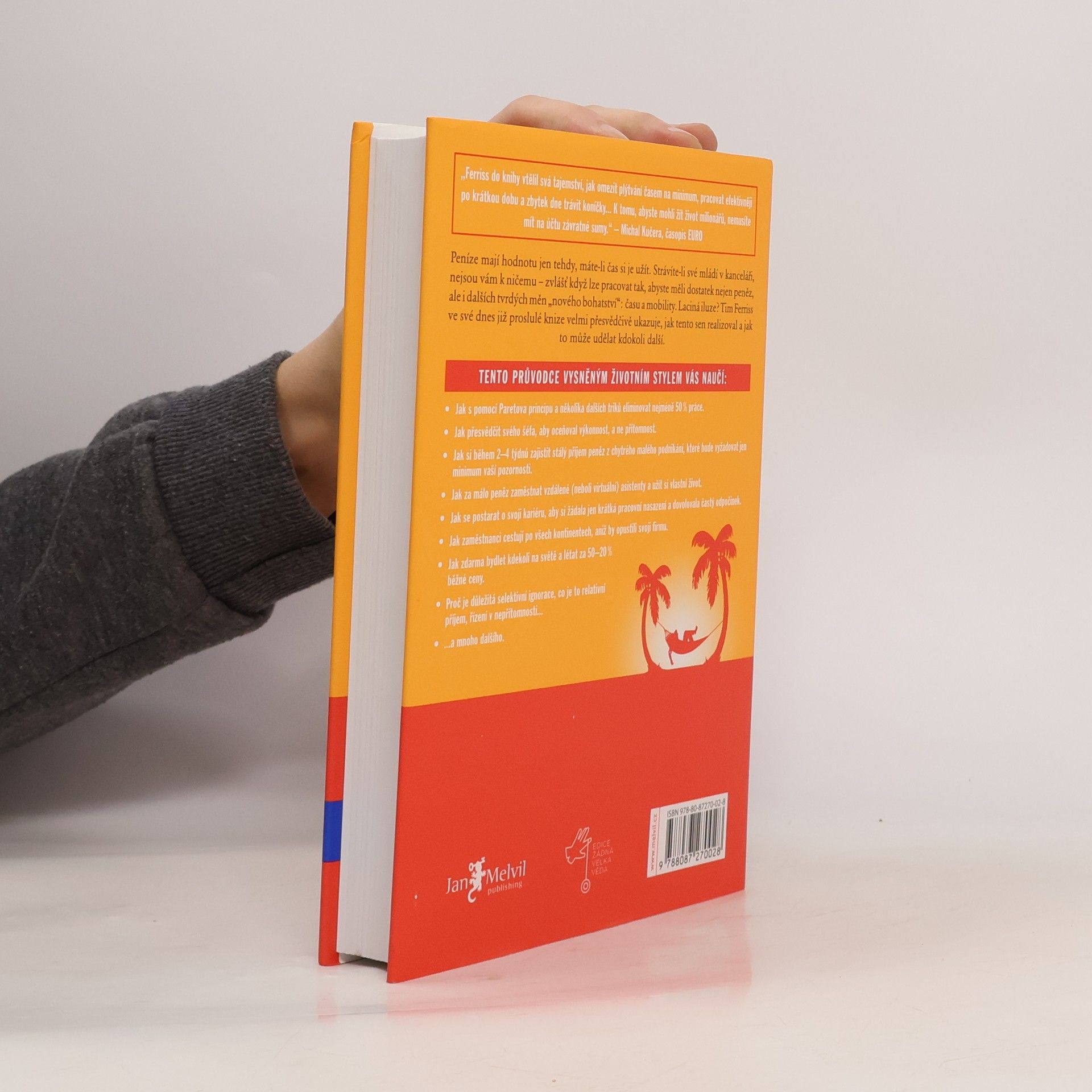 Peníze mají hodnotu jen tehdy, máte-li čas si je užít. Strávíte-li své mládí v kanceláři, nejsou vám k ničemu zvlášť když lze pracovat tak, abyste měli dostatek nejen peněz, ale i dalších tvrdých měn nového bohatství: času a mobility. Laciná iluze? Tim Ferriss ve své dnes již proslulé knize velmi přesvědčivě ukazuje, jak tento sen realizoval a jak to může udělat kdokoli další. Kniha je světovým bestsellerem a vyšla v 35 zemích.