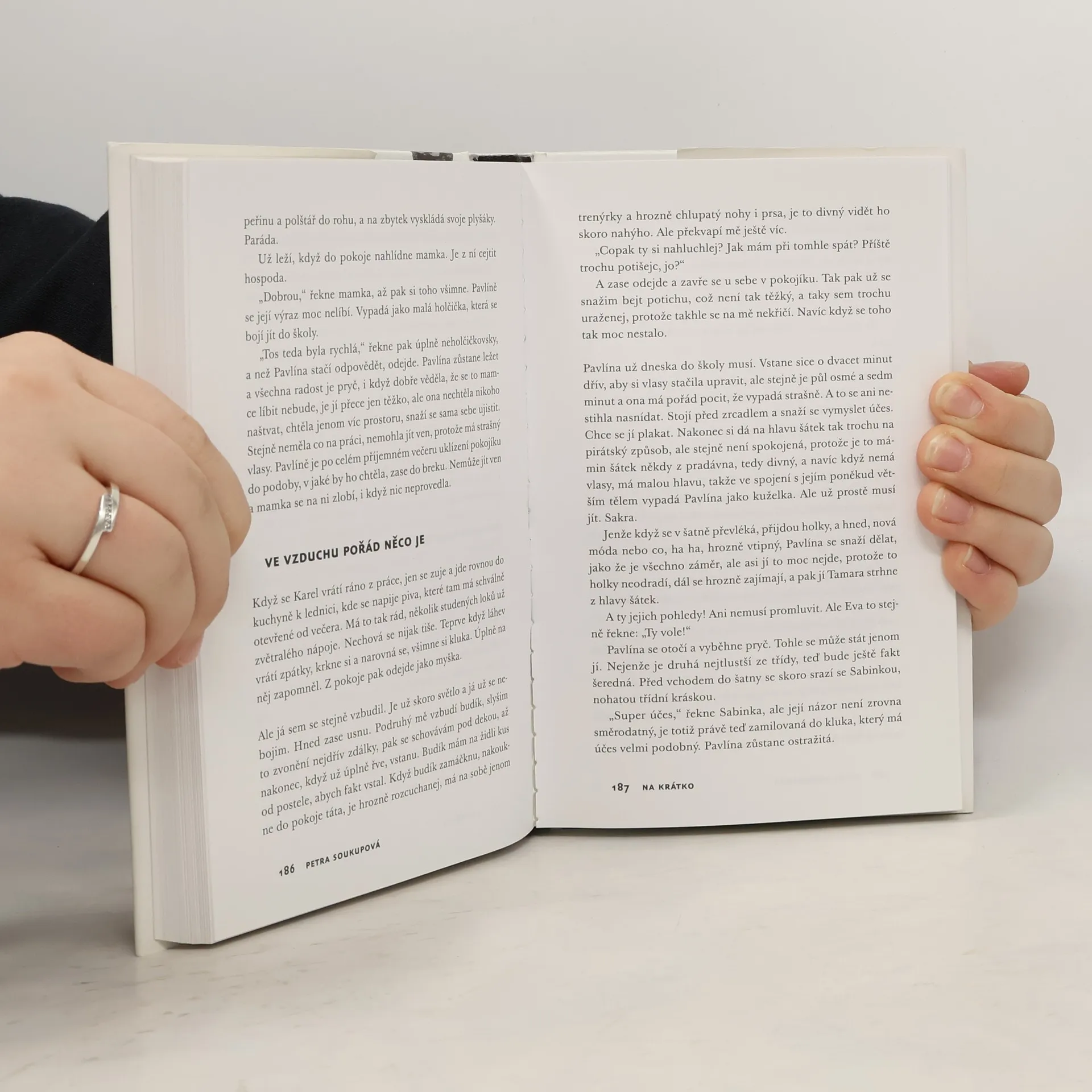 Intimní rodinné a partnerské vztahy jsou tradičně spojovány s ženskými románky, avšak vyšší literatura se tomuto tématu často vyhýbá. O to více zaujme, když autor dokáže toto téma uchopit originálně a nesentimentálně. Petře Soukupové se to podařilo v její první knize a nyní i v novém souboru tří rozsáhlých povídek, kde opět zkoumá rodinné vztahy, tentokrát z pohledu dětských hrdinů. V prvních dvou povídkách jsou děti vypravěči, zatímco ve třetí se dospělá žena vrací k vzpomínkám na dětství. Hrdinové se snaží vyrovnat s rodinným traumatem, které je vzdaluje od blízkých a nutí je hledat svou identitu. Důraz není kladen na dramatické zvraty, ale na vnitřní prožitky postav. Autorka dokáže čtenáře vtáhnout do intimního prostoru, kde sdílí subtilní vnitřní hnutí, jež se jeví jako skutečná existenciální dramata. Paradoxně jazyk vyprávění téma spíše zcizuje, což ukazuje vypravěčský talent Petry Soukupové. Nová kniha tak představuje v české literatuře polohu, která nutí čtenáře přemýšlet o zdánlivě nedramatických okamžicích jeho života, což je smyslem každé dobré literatury.