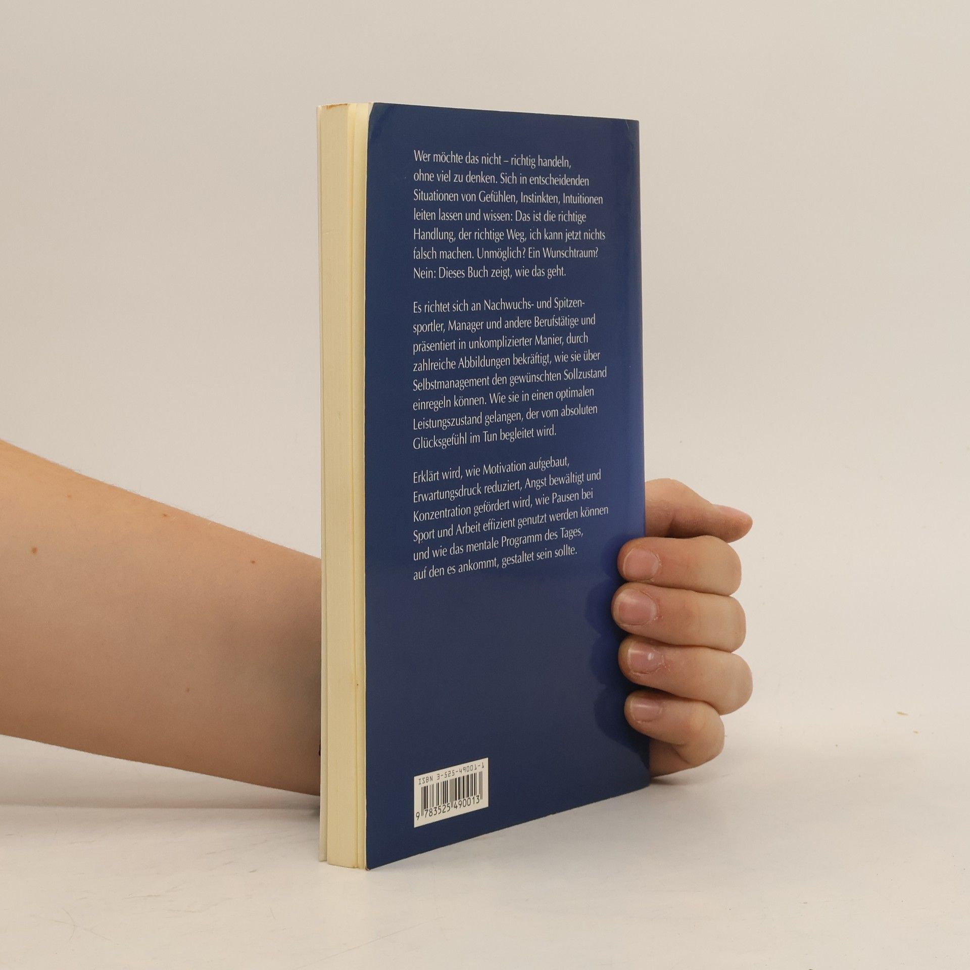 Wer möchte das nicht – richtig handeln, ohne viel zu denken. Sich in entscheidenden Situationen von Gefühlen, Instinkten, Intuitionen leiten lassen und wissen: Das ist die richtige Handlung, der richtige Weg, ich kann jetzt nichts falsch machen. Unmöglich? Ein Wunschtraum? Nein: Dieses Buch zeigt, wie das geht. Es richtet sich an Nachwuchs- und Spitzensportler, Manager und andere Berufstätige und präsentiert in unkomplizierter Manier, durch zahlreiche Abbildungen bekräftigt, wie sie über Selbstmanagement den gewünschten Sollzustand einregeln können. Wie sie in einen optimalen Leistungszustand gelangen, der vom absoluten Glücksgefühl im Tun begleitet wird. Erklärt wird, wie Motivation aufgebaut, Erwartungsdruck reduziert, Angst bewältigt und Konzentration gefördert wird, wie Pausen bei Sport und Arbeit effizient genutzt werden können und wie das mentale Programm des Tages, auf den es ankommt, gestaltet sein sollte.