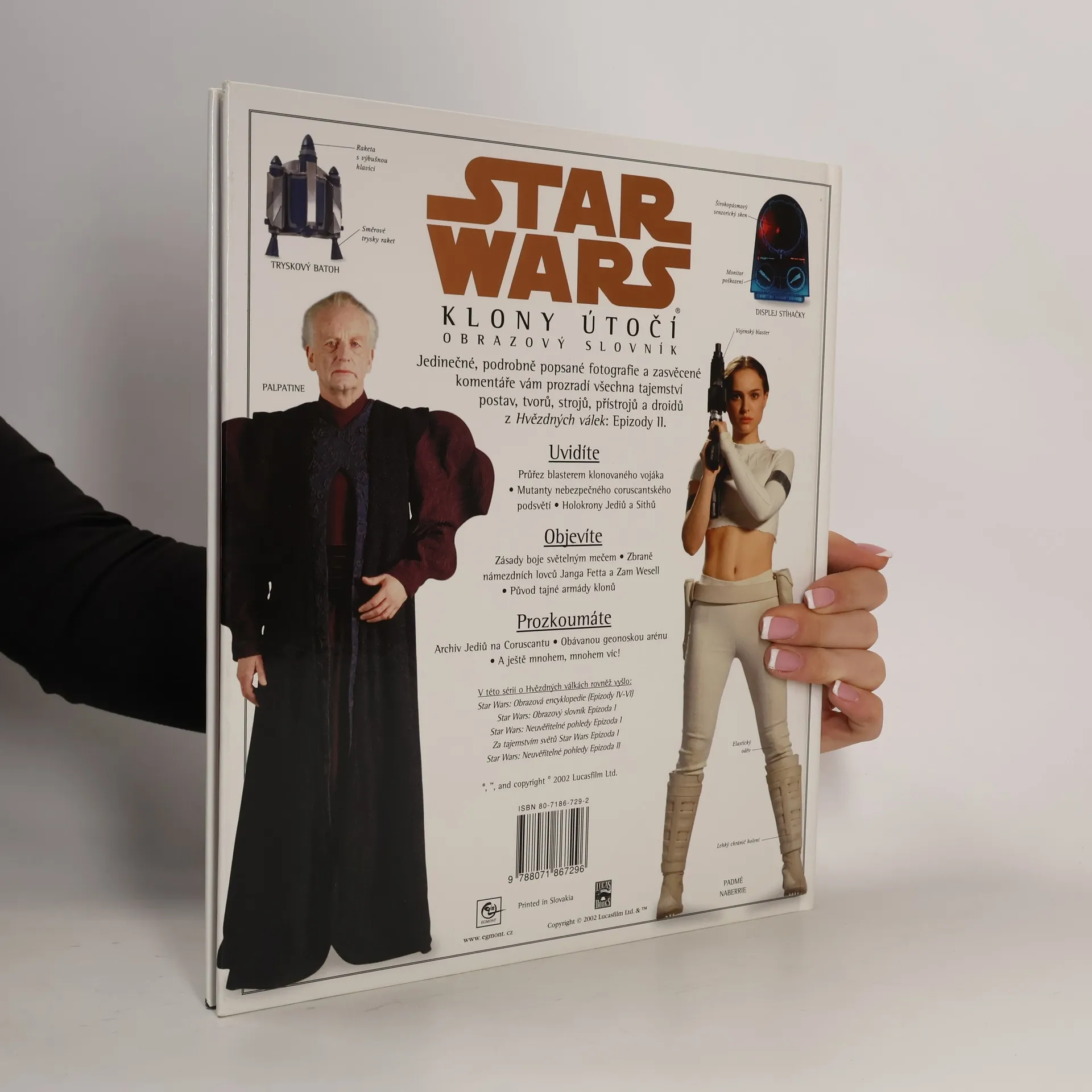 Jedinečné, podrobně popsané fotografie a zasvěcené komentáře vám prozradí všechna tajemství postav, tvorů, strojů, přístrojů a droidů z Hvězdných válek: Epizody II. Uvidíte: •Průřez blasterem klonovaného vojáka •Mutanty nebezpečného coruscantského podsvětí •Holokrony Jediů a Sithů Objevíte: •Zásady boje světelným mečem •Zbraně námezdních lovců Janfa Fetta a Zam Vesell •Původ tajné armády klonů Prozkoumáte: •Archiv Jediů na Coruscantu •Obávanou geonoskou arénu •A ještě mnohem, mnohem víc!