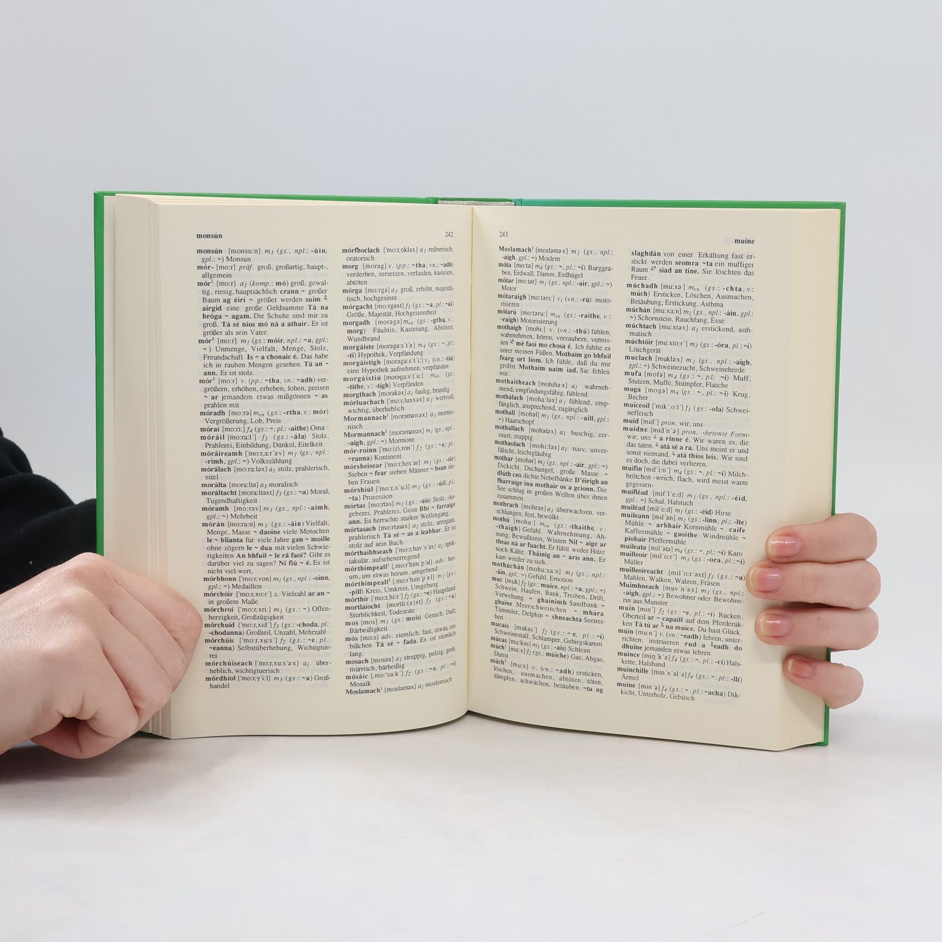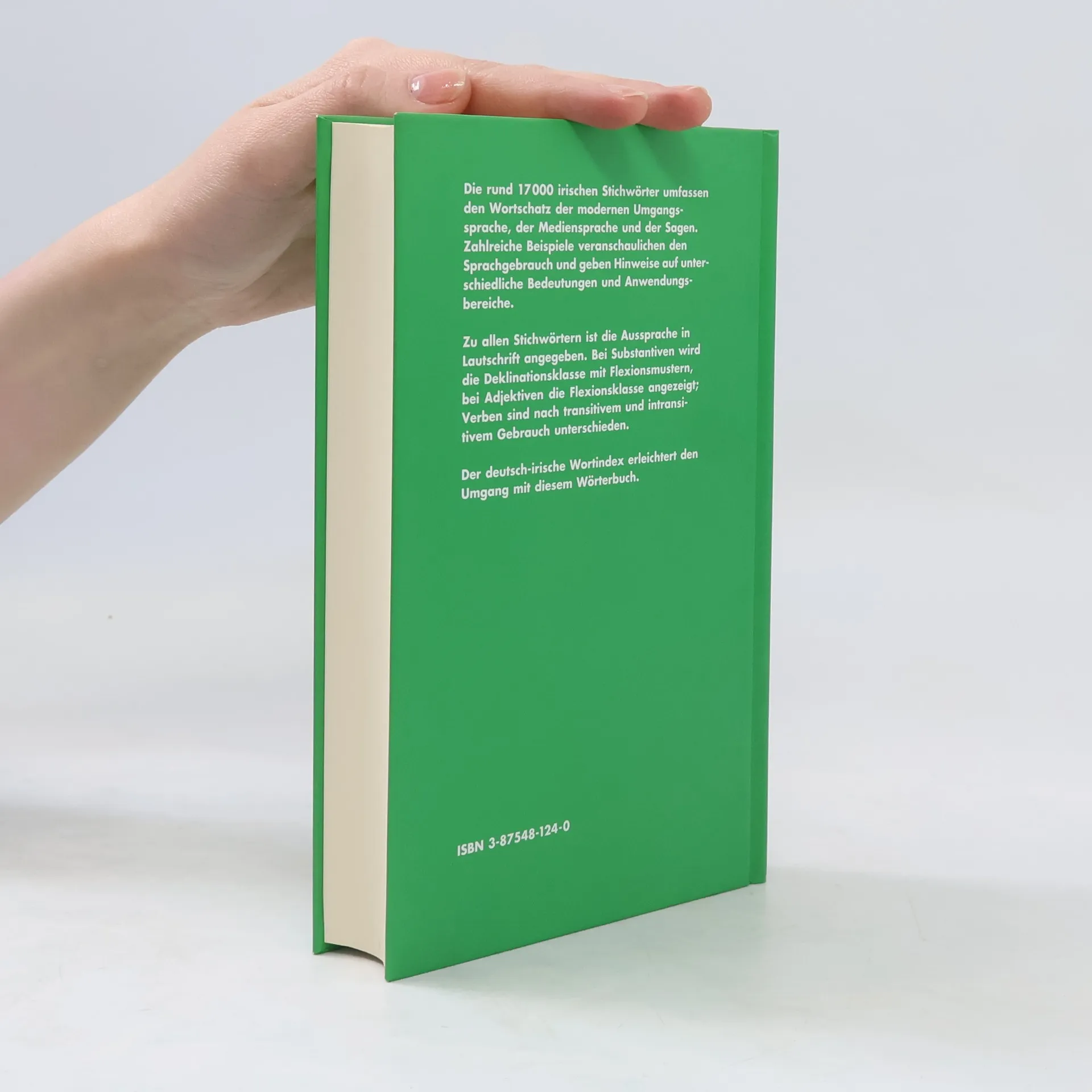 Die rund 17.000 irischen Stichwörter umfassen den Wortschatz der modernen Umgangssprache, der Mediensprache und der Sagen. Zu allen Stichwörtern ist die Aussprache in Lautschrift angegeben. Bei Substantiven wird die Deklinationsklasse mit Flexionsmustern, bei Adjektiven die Flexionsklasse angezeigt; Verben sind nach transitivem und intransitivem Gebrauch unterschieden. Zahlreiche Beispiele veranschaulichen den Gebrauch der Sprache und geben Hinweise auf unterschiedliche Bedeutungen und Anwendungsbereiche. Der deutsch-irische Wortindex erleichtert den Umgang mit diesem Wörterbuch.