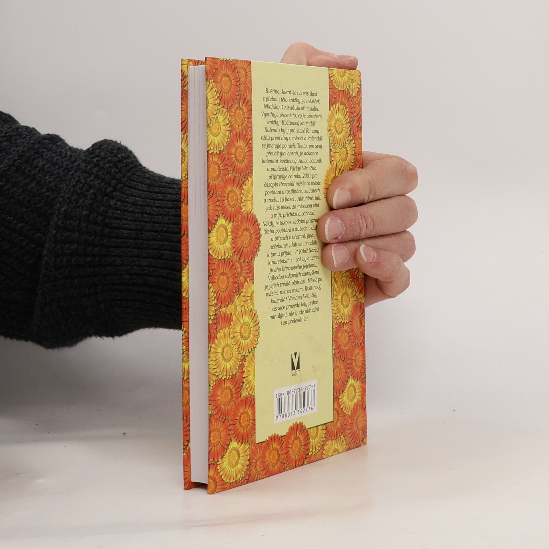 Květina, která se na vás dívá z přebalu této knížky je měsíček lékařský, "Calendula officinalis". Aniž se jakkoliv domlouvali autor, nakladatel a výtvarník, vystihuje přesně to, co je obsahem knížky: Květinový kalendář. Autor, botanik a publicista Václav Větvička připravuje od roku 2001 pro časopis Receptář měsíc co měsíc povídání o rostlinách, zvířatech a trochu i o lidech. Někdy je takové setkání průzračné (třeba povídání o dubech v dubnu a břízách v březnu), jindy nečekané: "Jak ten chudák k tomu přijde...?" Kdo? Narcis k narcisismu - což bylo téma jiného březnového fejetonu.