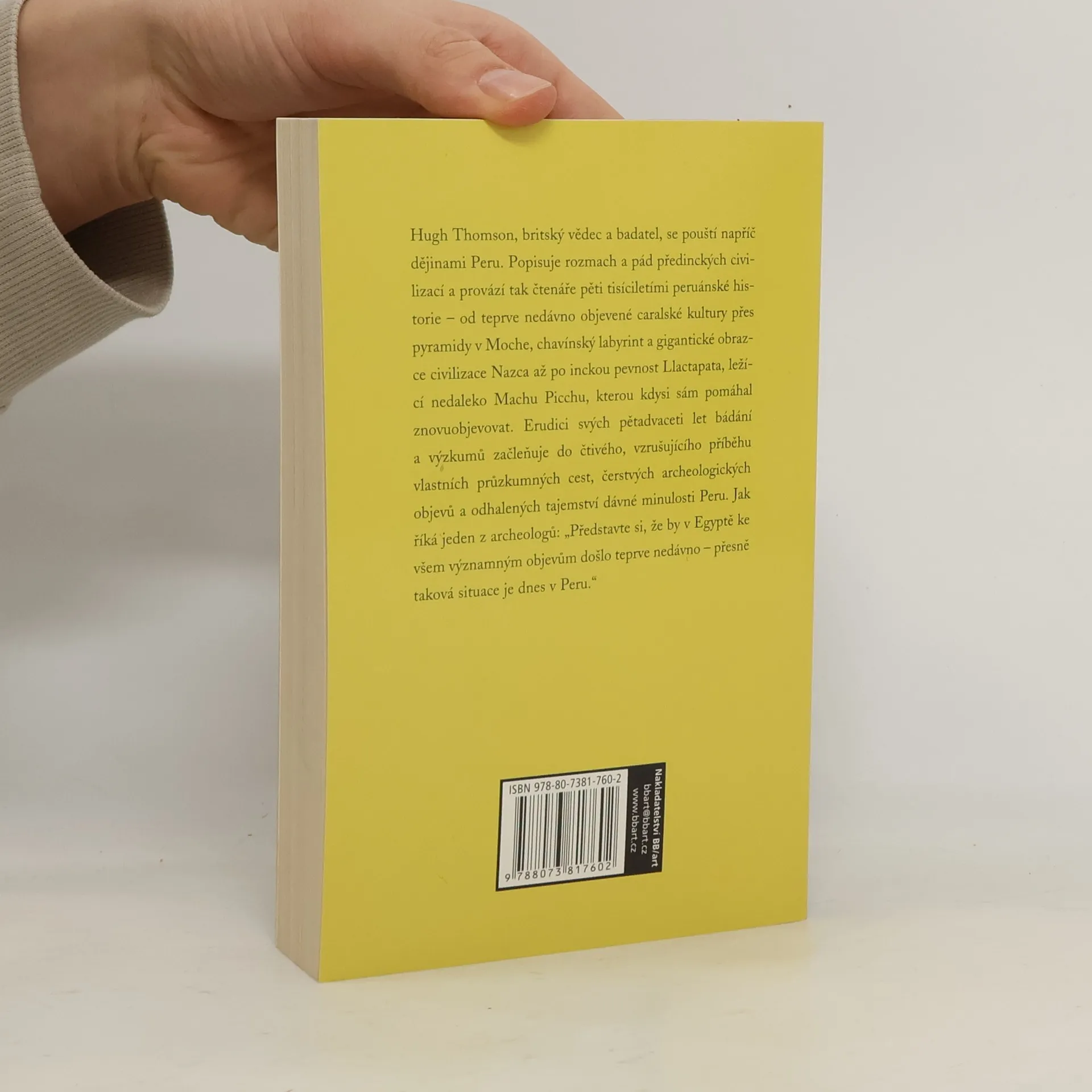 Po své vysoce ceněné Bílé skále, v níž se zabývá říši Inků, se tento britský vědec a badatel tentokrát pouští napříč dějinami Peru. Popisuje rozmach a pád předinckých civilizací a provází tak čtenáře pěti tisíciletími peruánské historie – od teprve nedávno objevené caralské kultury přes pyramidy v Moche, chavínský labyrint a gigantické obrazce civilizace Nazca až po inckou pevnost Llactapata, ležící nedaleko Machu Picchu, kterou kdysi sám pomáhal znovuobjevovat. Erudici svých pětadvaceti let bádání a výzkumů začleňuje do čtivého, vzrušujícího příběhu vlastních průzkumných cest, čerstvých archeologických objevů a odhalených tajemství dávné minulosti Peru. Jak říká jeden z archeologů: „Představte si, že by v Egyptě ke všem významným objevům došlo teprve nedávno – přesně taková situace je dnes v Peru.“ Podle časopisu National Geographic patří Hugh Thomson ke vzácnému druhu badatelů; je to spisovatel, který bádá a nikoli badatel, který píše. Navíc dokáže psát s nebývalou a velmi sympatickou pokorou i o svých významných objevech a úspěších; během výprav do peruánských And se mu v nepřístupném terénu Vilcabamby podařilo nejen znovuobjevit na dlouhá desetiletí ztracenou pevnost Llactapata, ale i dosud neznámé skalní město Cota Coca, kam se Inkové pravděpodobně uchýlili po příchodu Španělů.