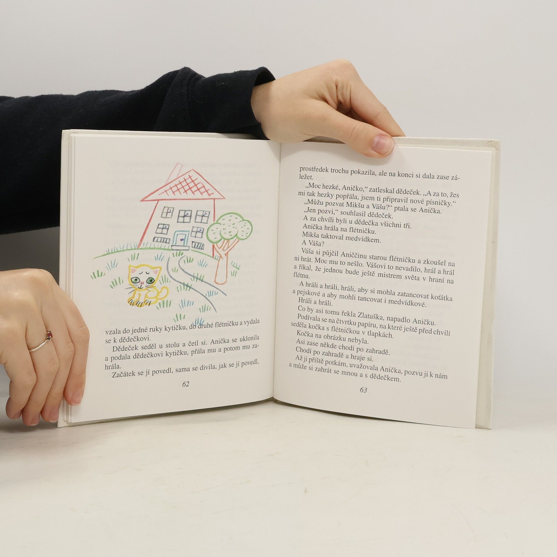 V barevné veselé knížce se děti opět setkají s Aničkou, malým Mikšou, Vašíkem a hlavně s kouzelnou nedělní kočkou Zlatuškou. Žlutá kočka žije v domečku, který Anička nakreslila jednou v neděli na čtvrtku. Ale čas od času z papíru zmizí a vyrazí do světa. Teď Aničce radí jak zahrát kouzelnou písničku na flétnu a potěšit dědečka, který má narozeniny. Veselé vyprávění s půvabnými ilustracemi Heleny Zmatlíkové je určeno k předčítání i k nácviku prvního samostatného čtení.... celý text
