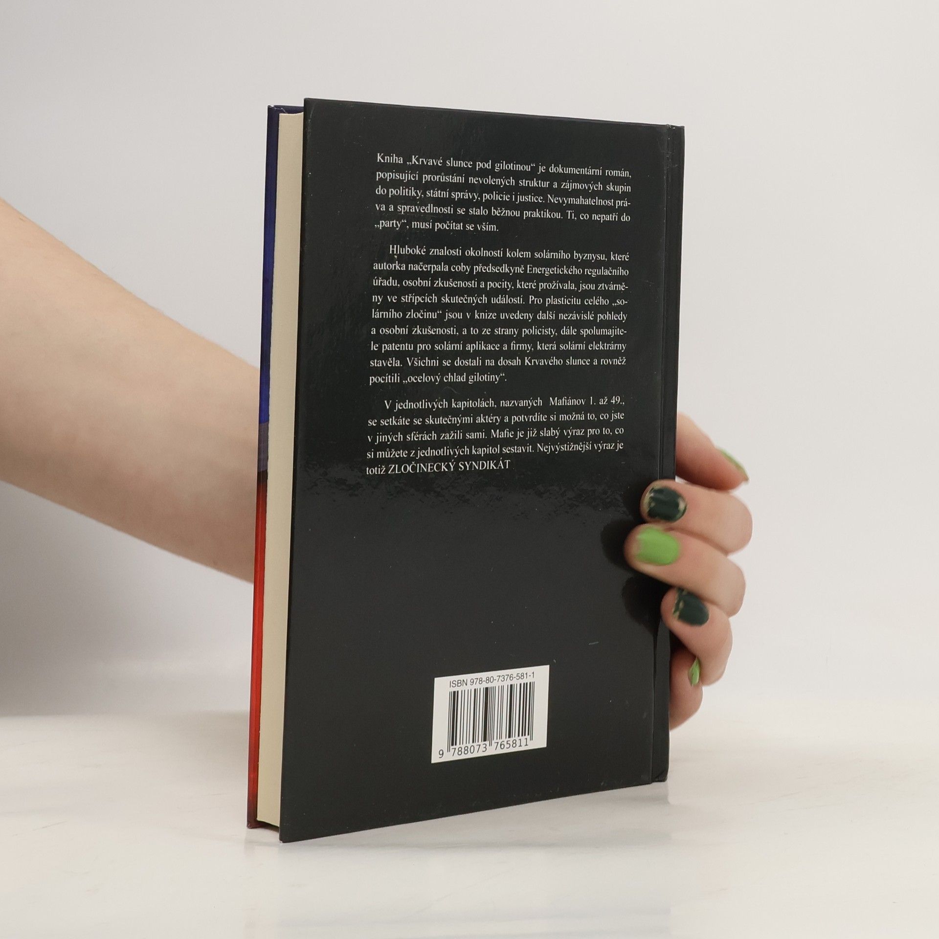 Kniha „Krvavé slunce pod gilotinou“ je dokumentární román popisující prorůstání nevolených struktur a zájmových skupin do politiky, státní správy, policie, justice. Nevymahatelnost práva a spravedlnosti se stalo běžnou praktikou a ti co nepatří do „party“ musí počítat se vším. Hluboké znalosti okolností kolem solárního byznysu, které autorka načerpala coby předsedkyně Energetického regulačního úřadu, osobní zkušenosti a pocity, které prožívala, jsou ztvárněny ve střípcích skutečných událostí. Pro plasticitu celého „solárního zločinu“ jsou v knize uvedeny další nezávislé pohledy a osobní zkušenosti. A to ze strany policisty, spolumajitele patentu pro solární aplikace a firmy, která solární elektrárny stavěla. Všichni se dostali na dosah krvavého slunce a rovněž pocítili ocelový chlad gilotiny. V jednotlivých kapitolách nazvaných Mafiánov 1. až 49. se setkáte se skutečnými aktéry a potvrdíte si možná to, co jste v jiných sférách zažili sami.