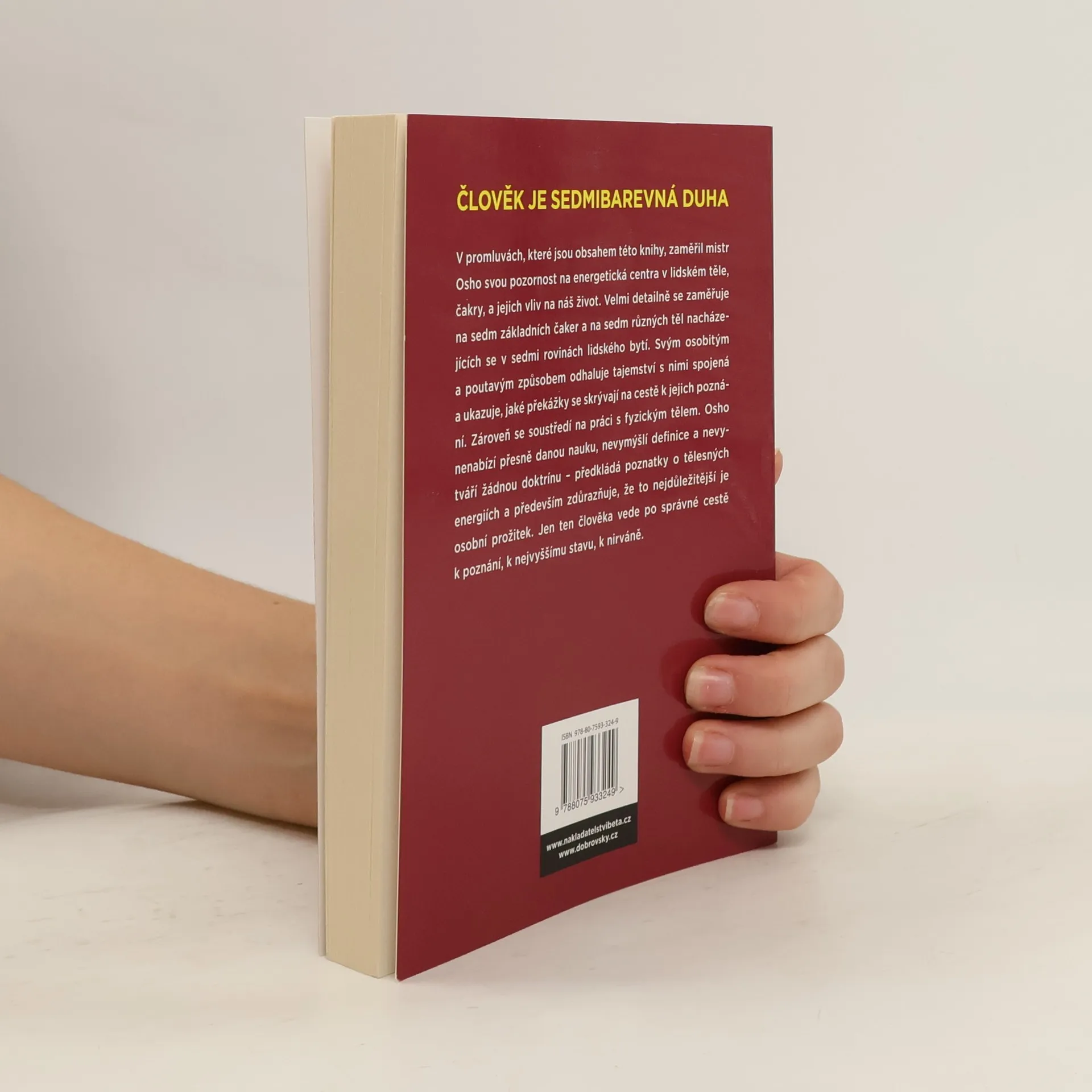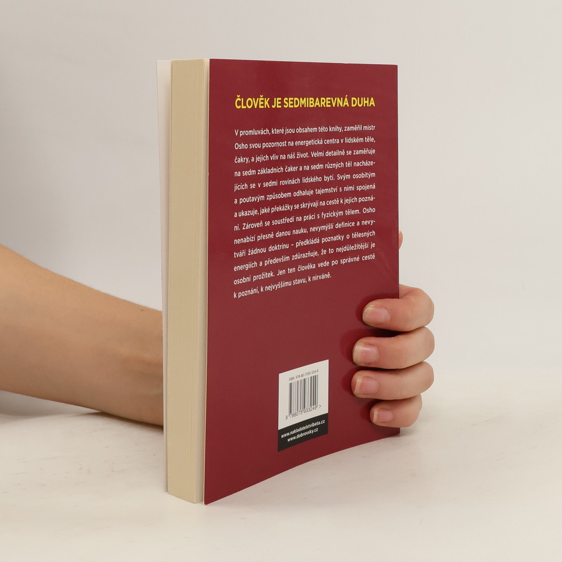 Člověk je sedmibarevná duha Těmito slovy uvádí mistr Osho svou promluvu o energetických centrech v lidském těle nazývaných čakry a o jejich vlivu na život člověka. Velmi detailně se zaměřuje na sedm základních čaker a na sedm různých těl nacházejících se v sedmi rovinách lidského bytí. Svým osobitým a poutavým způsobem odhaluje jejich tajemství a ukazuje, jaké překážky se skrývají na cestě k jejich poznání. Zároveň se soustředí na práci s fyzickým tělem, na tradiční metody jeho pročišťování a také na různé pohledy dnešní vědy na tuto otázku. Osho nenabízí přesně danou nauku, nevymýšlí definice a nevytváří žádnou doktrínu – předkládá poznatky o tělesných energií a především zdůrazňuje, že to nejdůležitější je osobní prožitek.