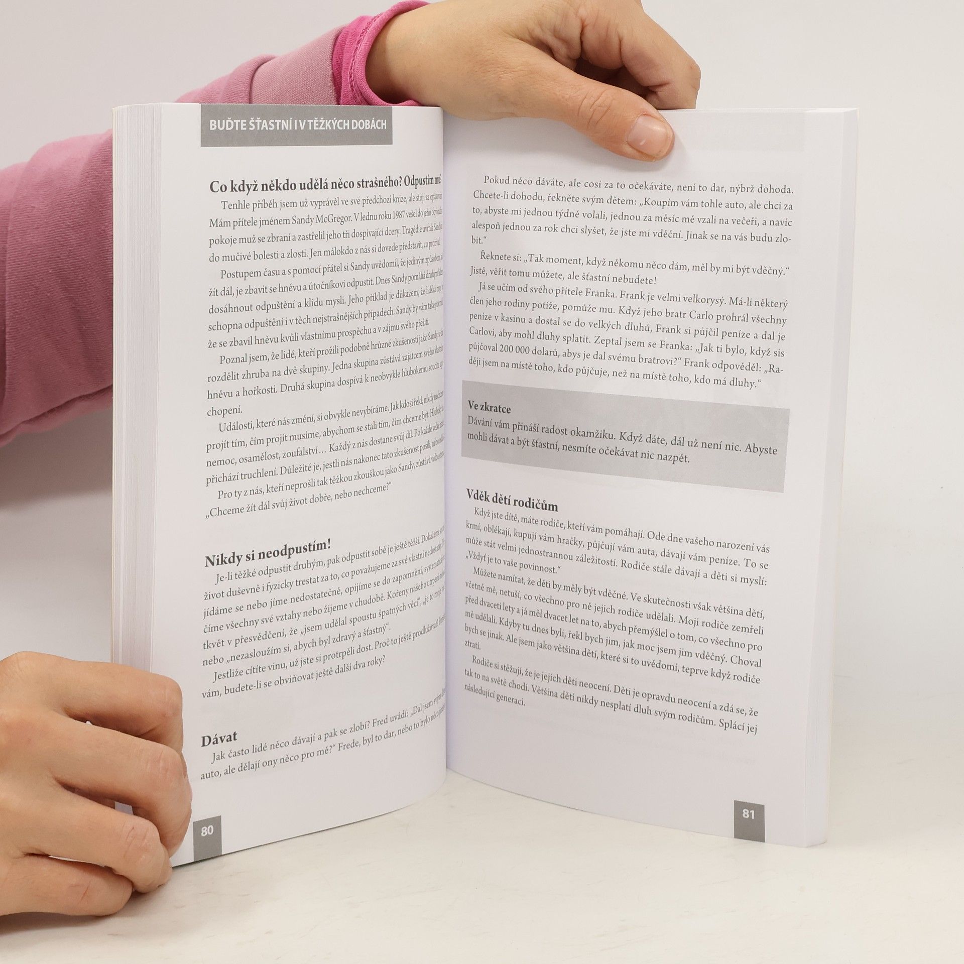 Hledat štěstí není sobecké. Sobecké je být nešťastný. Spokojení lidé jsou vnímavější a pozornější, jsou lepšími partnery, přáteli i zaměstnanci. Utrápení lidé se zajímají jen o sebe a ostatním berou energii. Štěstí netkví v tom, co nám osud nadělí, ale v našem postoji k sobě samému a k životním událostem. Prvním krokem k vyrovnané existenci je přijmout to, co máme, nečekat a nesnít o tom, že budeme šťastní teprve „až se něco stane“. Andrew Matthews dokazuje, že člověk může dosáhnout štěstí za všech okolností, v každém okamžiku, už předtím, než se mu podaří zhubnout, než najde ideálního partnera nebo získá vysněné zaměstnání.