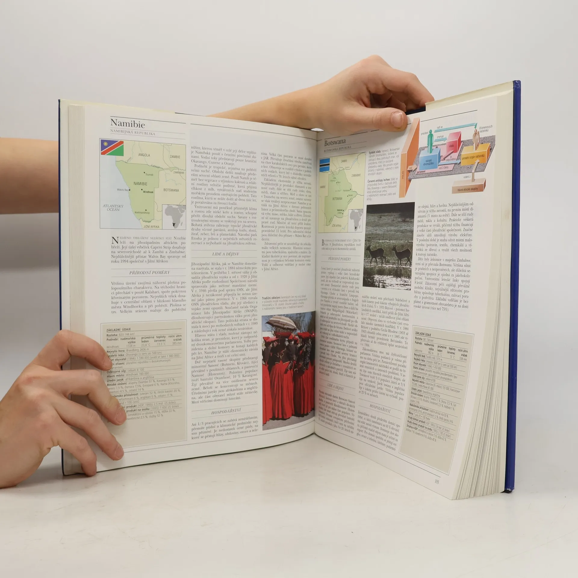 V posledním desetiletí jsme byli svědky posunů hranic a vzniku nových států, ale dosud chyběla souhrnná příručka, která by informovala o těchto změnách. Encyklopedie Zeměpis světa se zaměřuje na všechny země, včetně těch vzniklých po rozpadu SSSR, Jugoslávie a Československa. Obsahuje podrobné profily 189 zemí, které jsou mnohem obsáhlejší než obvyklé encyklopedické svazky, a zahrnuje mapy, fakta, statistiky a fotografie, což ji činí jednou z nejpraktičtějších příruček. Rozsah hesel se liší, od 50 stran pro USA po jednostránkové profily menších zemí, přičemž každé heslo je založeno na aktuálních údajích a strukturováno tak, aby usnadnilo porovnávání. Profily zahrnují tři hlavní oddíly: Přírodní poměry, Společnost a Hospodářství, popisující klimatické podmínky, historické události, kulturu a hospodářství. Země jsou rozděleny podle geografických oblastí, přičemž každá má svou mapu a obsahuje státní vlajku, umístění na kontinentu a základní statistické údaje. Některá hesla obsahují i ilustrované články o unikátních kulturních a historických jevech. V knize jsou uvedena chybná ISBN 80-901727-6-8 a 80-7176-022-6.