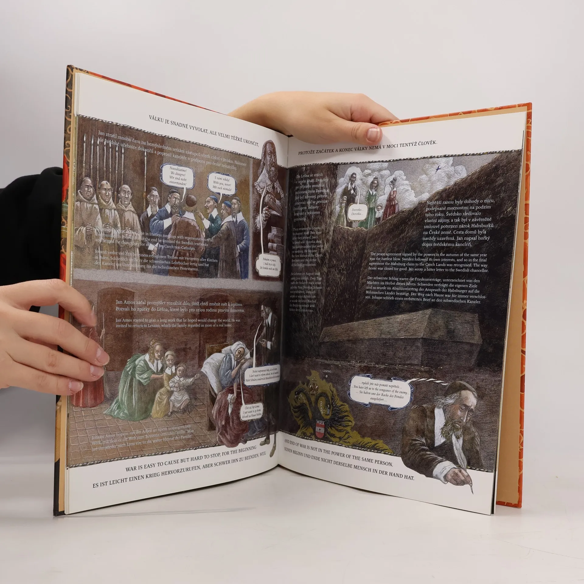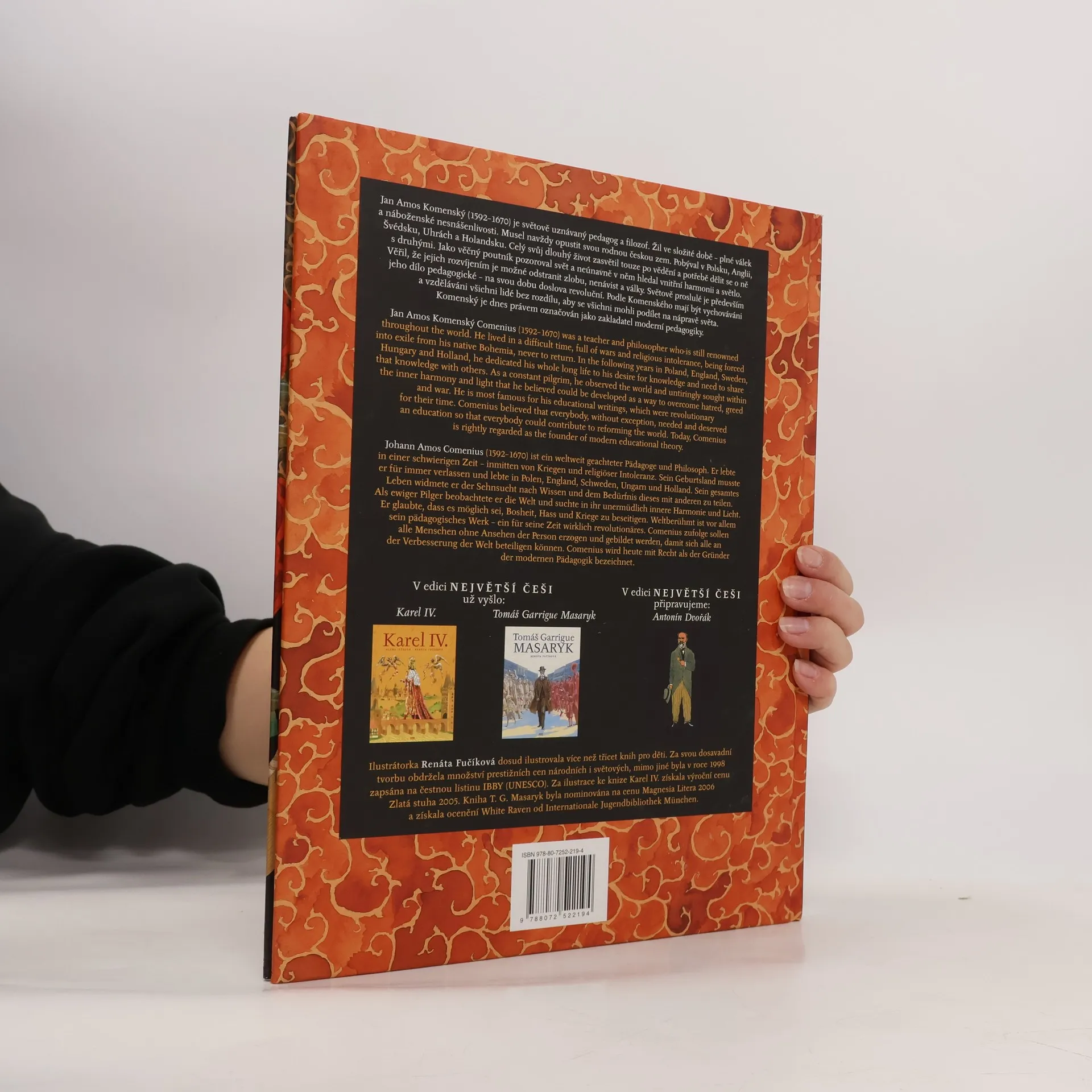 Kniha velkého formátu a velkolepých ilustrací včetně dobových map představuje největšího ducha, jakého Čechy daly Evropě a světu - jeho život i dílo, to všechno velmi přístupnou a srozumitelnou formou. Třetí titul edice Největší Češi představuje Jana Amose Komenského jako našeho největšího filozofa, učence, který zasvětil celý svůj život šíření vědění a ideálů. Postupně jsou představeny jednotlivé osobnosti tehdejší Evropy, které při svém dramatickém putování potkal. Jedná se o knihu, která emotivně představuje radosti i utrpení Komenského, jeho touhy a ustavičné hledání nejvyššího dobra. Významný prvek představuje i předložení jakési dobové fresky, pozadí událostí Komenského života, vyobrazení konfliktů třicetileté války v kontrastu s utopistickými mírovými představami našeho největšího filozofa - tak cenné a zajímavé v dnešní době společného soužití a spolupráce celé Evropy. Děj samotný je vyprávěn česky a souběžně anglicky a německy. Tím naprosto přirozeně připomíná jedno ze stěžejních děl Komenského - Brána jazyků otevřená. Čtenáři tak mohou knihu využít i k zajímavému srovnání všech jazykových verzí a zároveň i k rozšíření slovní zásoby. Kniha zároveň nalezne uplatnění i jako reprezentativní dárek do zahraničí. Vždyť čím lepším se můžeme v rámci evropské civilizace pochlubit, než naším nejvýznamnějším myslitelem, který ve své době posouval dopředu tehdejší poznání světa.