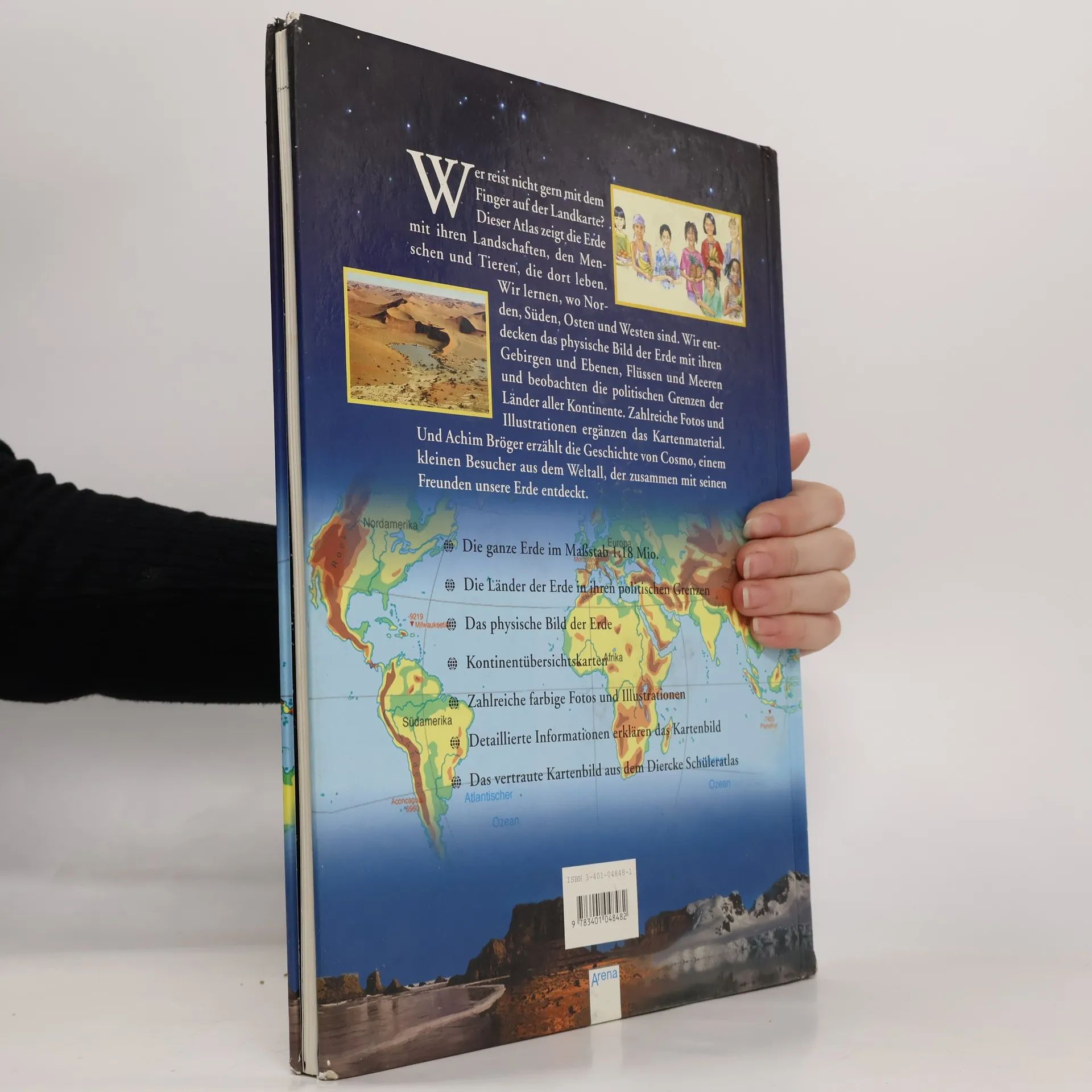 Kartographische Informationen verbinden sich in diesem Atlas mit einer spannenden Geschichte: Zusammen mit dem kleinen außerirdischen Wesen Cosmos betrachten die Kinder zuerst die Erde aus dem Weltraum und begleiten ihn dann auf seiner Reise in alle Kontinente. Sie erfahren dabei nicht nur, wie man richtig Karten liest, sondern lernen auch die Erde, ihre unterschiedlichen Landschaften, ihre Bewohner und ihre Kulturen immer besser kennen.