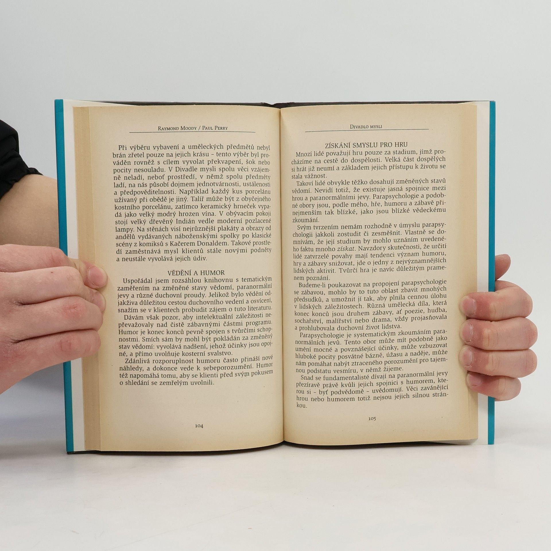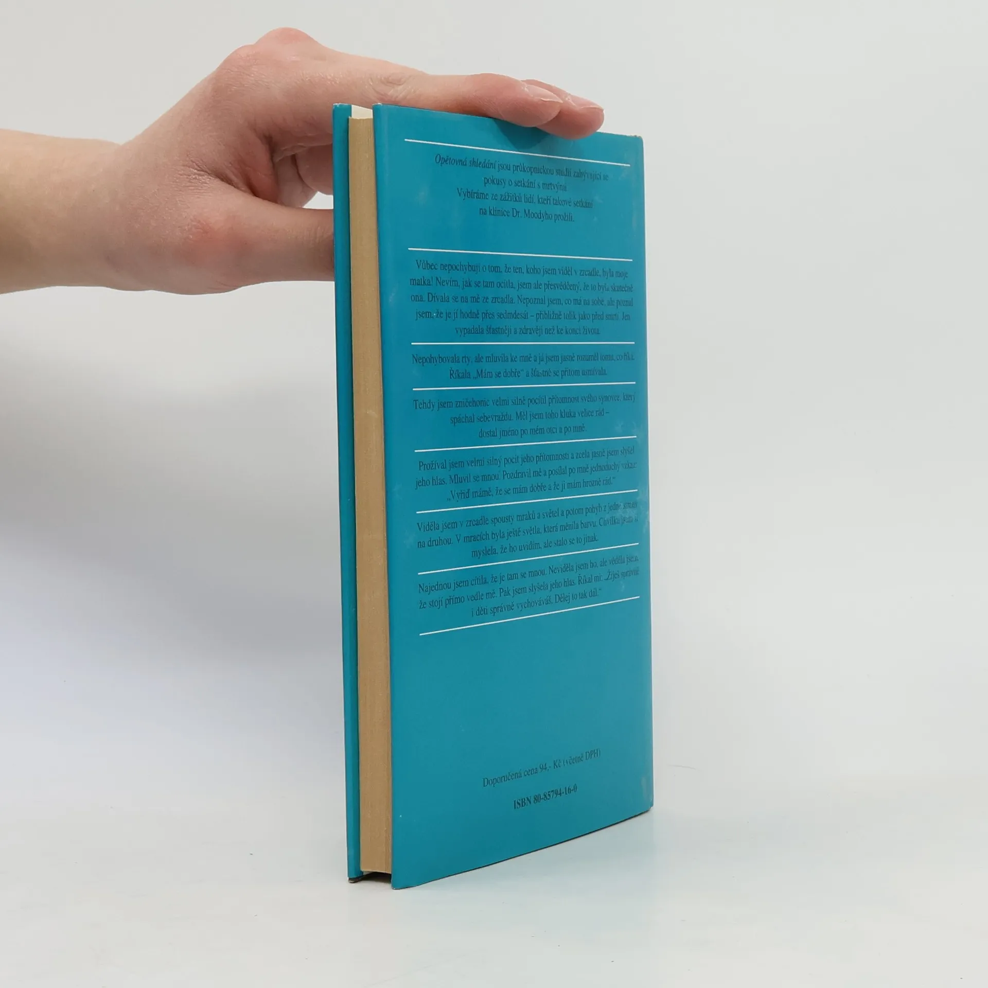 Opětovná shledání jsou průkopnickou studií zabývající se pokusy o setkání s mrtvými. Vybíráme ze zážitků lidí, kteří takové setkání na klinice Dr. Moodyho prožili. Vůbec nepochybuji o tom, že ten, koho jsem viděl v zrcadle, byla moje matka! Nevím, jak se tam ocitla, jsem ale přesvědčený, že to byla skutečně ona. Dívala se na mě ze zrcadla. Nepoznal jsem, co má na sobě, ale poznal jsem, že je jí hodně přes sedmdesát — přibližně tolik jako před smrtí. Jen vypadala šťastněji a zdravěji než ke konci života. Nepohybovala rty, ale mluvila ke mně a já jsem jasně rozuměl tomu, co říká. Říkala „Mám se dobře“ a šťastně se přitom usmívala. Tehdy jsem zničehonic velmi silně pocítil přítomnost svého synovce, který spáchal sebevraždu. Měl jsem toho kluka velice rád — dostal jméno po mém otci a po mně. Prožíval jsem velmi silný pocit jeho přítomnosti a zcela jasně jsem slyšel jeho hlas. Mluvil se mnou. Pozdravil mě a posílal po mně jednoduchý vzkaz: „Vyřiď mámě, že se mám dobře a že ji mám hrozně rád.“ Viděla jsem v zrcadle spousty mraků a světel a potom pohyb z jedné strany na druhou. V mracích byla ještě světla, která měnila barvu. Chvilku jsem si myslela, že ho uvidím, ale stalo se to jinak. Najednou jsem cítila, že je tam se mnou. Neviděla jsem ho, ale věděla jsem, že stojí přímo vedle mě. Pak jsem slyšela jeho hlas. Říkal mi: „Žiješ správně i děti správně vychováváš. Dělej to tak dál.“ Vydání první