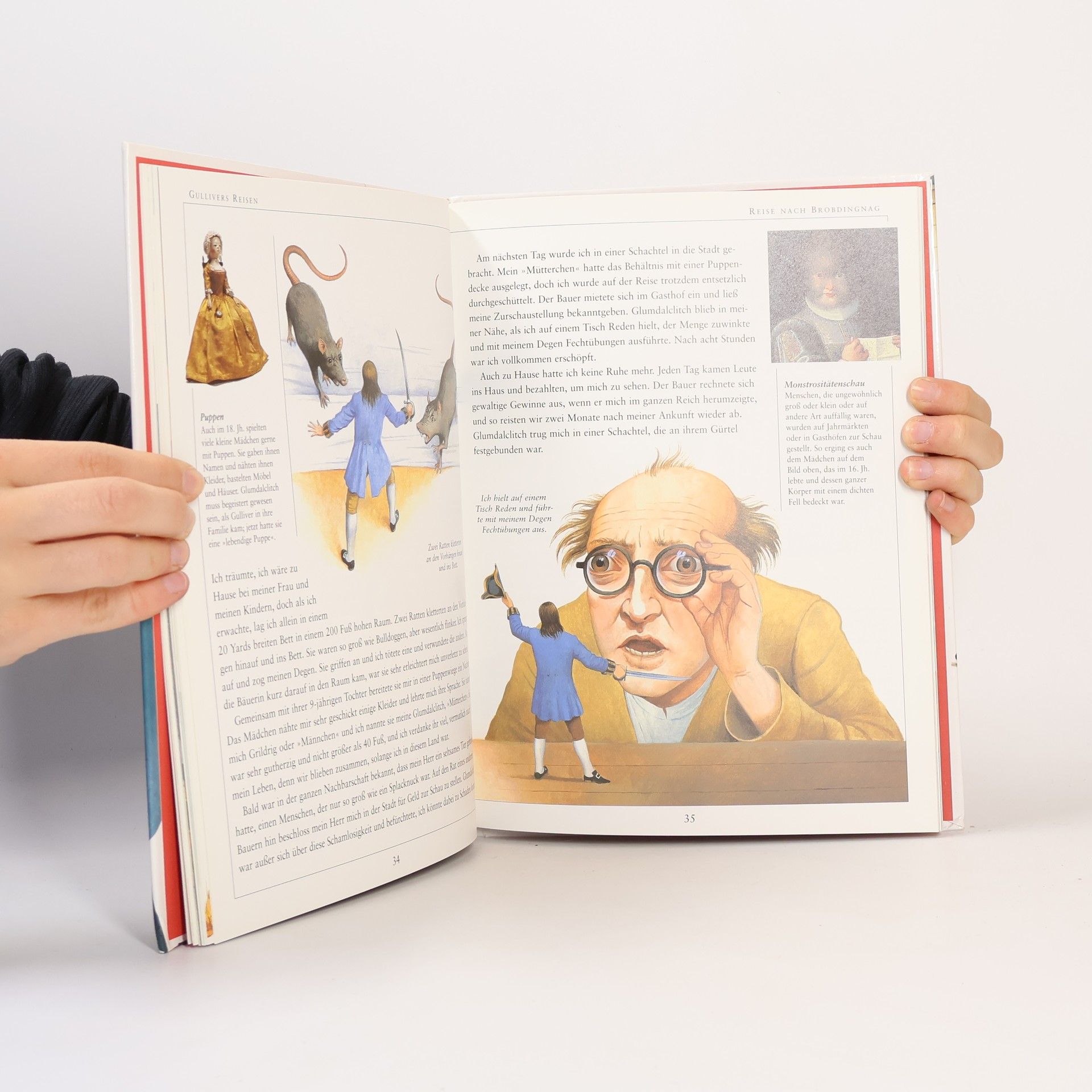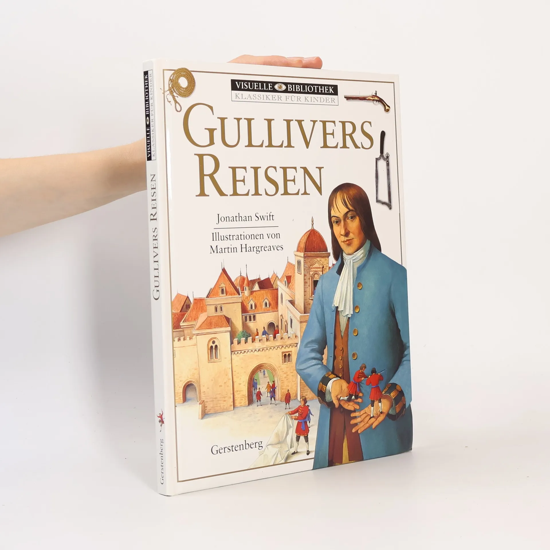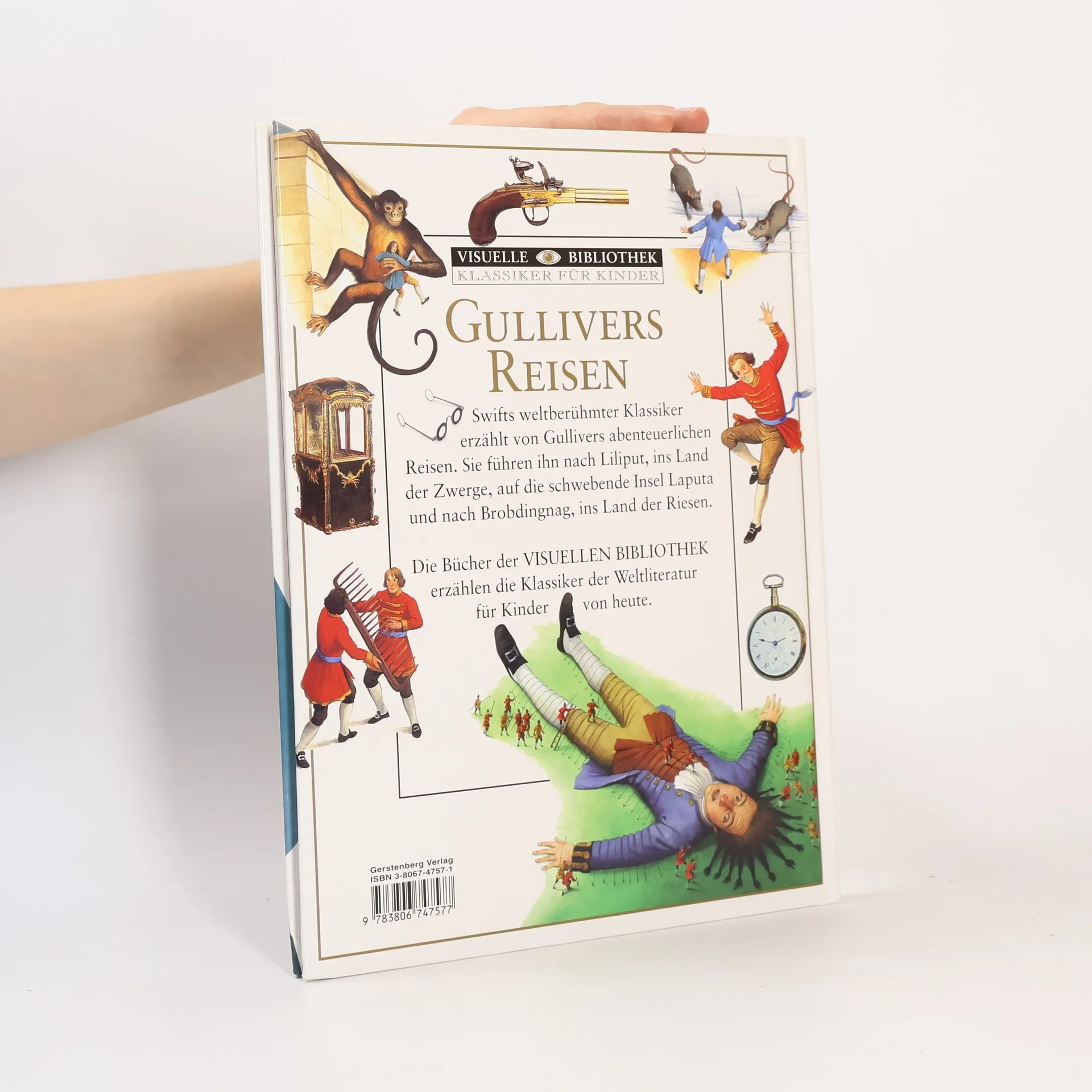 Swifts weltberühmter Klassiker erzählt von den abenteuerlichen Reisen, die Gulliver zuerst nach Liliput führen, wo die Menschen winzige Zwerge sind. Sie sind ihm deshalb nicht immer freundlich gesonnen. Aus Liliput entkommt Gulliver nach Brobdingnag, dem Land der Riesen, für die er nur ein Spielzeug ist. Weitere Reisen führen ihn auf die merkwürdige Insel Laputa und ins Land der Houyhnhnms, der vernünftigen Pferde,. Swifts Roman ist eine Satire auf die gesellschaftlichen Verhältnisse des 18. Jahrhunderts. Zahlreiche Fotos, Illustrationen und erläuternde Texte vermitteln einen guten Eindruck von der damaligen Zeit.