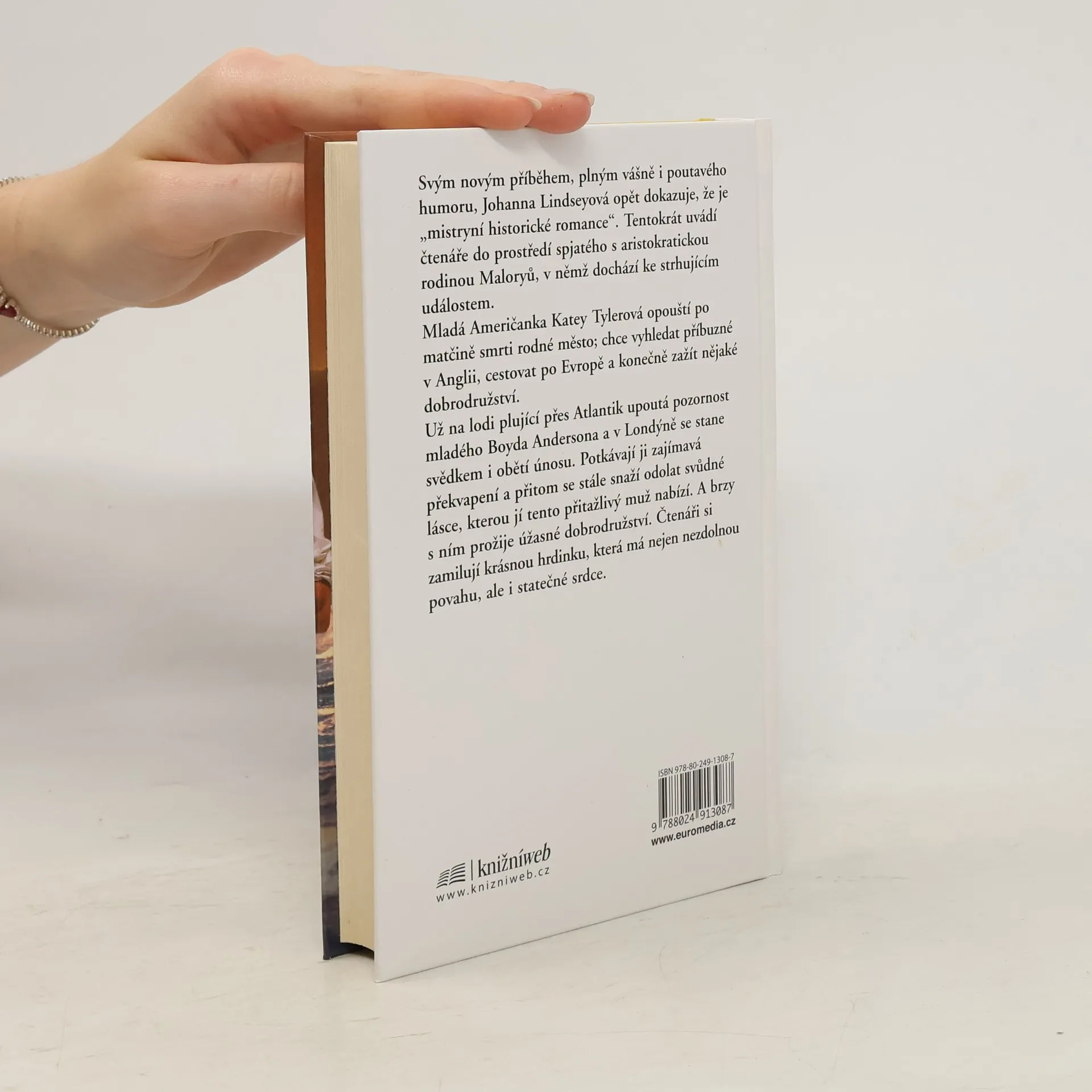 Svým novým příběhem, plným vášně i půvabného humoru, Johanna Lindseyová opět dokazuje, že je „mistryní historické romance“. Tentokrát uvádí čtenáře do prostředí spjatého s aristokratickou rodinou Maloryů, v němž dochází ke strhujícím událostem. Mladá Američanka Katey Tylerová opouští po matčině smrti rodné město; chce vyhledat příbuzné v Anglii, cestovat po Evropě a konečně zažít nějaké dobrodružství. Už na lodi plující přes Atlantik upoutá pozornost mladého Boyda Andersona a v Londýně se stane svědkem i obětí únosu. Potkávají ji zajímavá překvapení a přitom se stále snaží odolat svůdné lásce, kterou jí tento přitažlivý muž nabízí. A brzy s ním prožije úžasné dobrodružství. Čtenáři si zamilují krásnou hrdinku, která má nejen nezdolnou povahu, ale i statečné srdce.