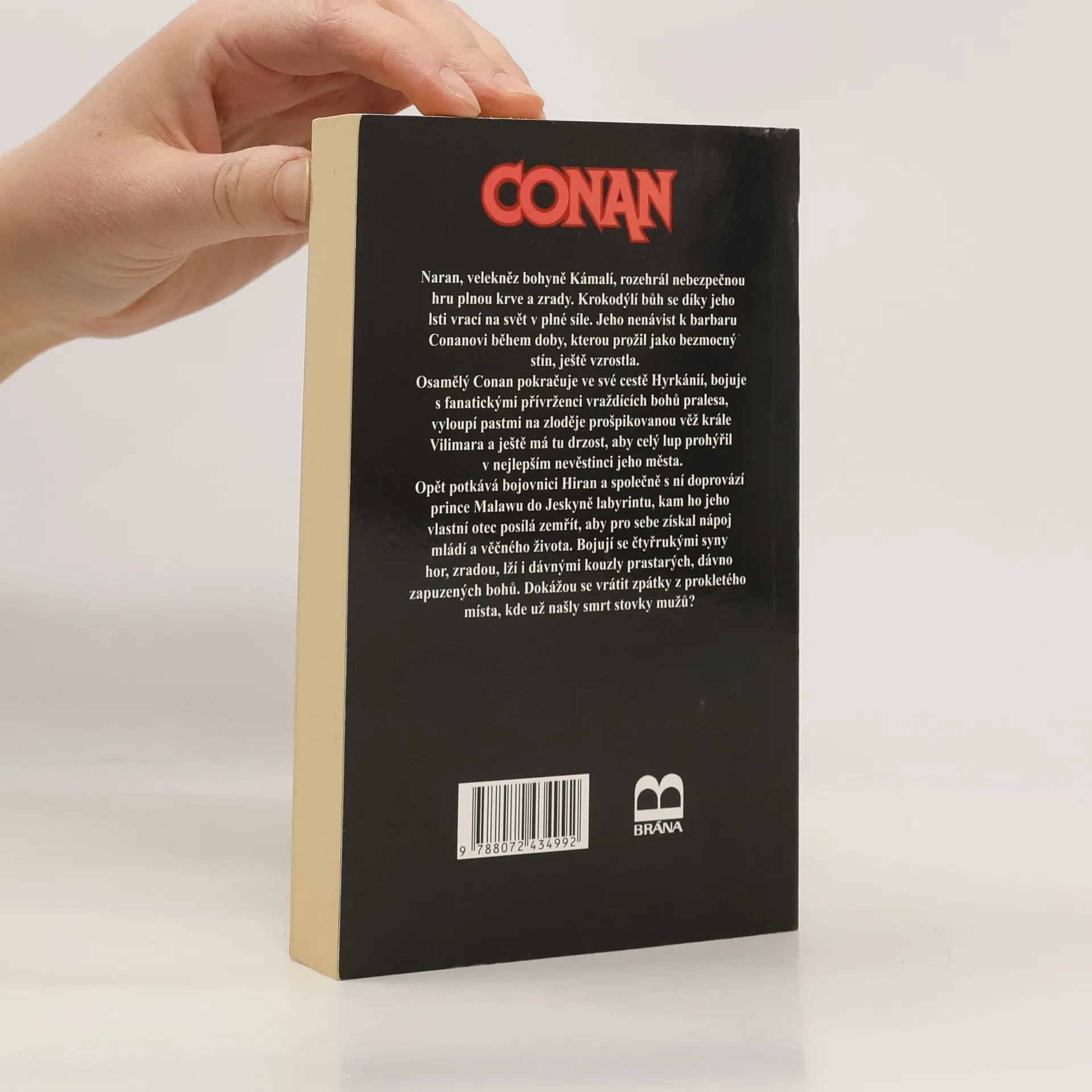 Naran, velekněz bohyně Kámalí, rozehrál nebezpečnou hru plnou krve a zrady. Krokodýlí bůh se díky jeho lsti vrací na svět v plné síle. Jeho nenávist k barbaru Conanovi během doby, kterou prožil jako bezmocný stín, ještě vzrostla. Osamělý Conan pokračuje ve své cestě Hyrkánií, bojuje s fanatickými přívrženci vraždících bohů pralesa, vyloupí pastmii na zloděje prošpikovanou věž krále Vilimara a ještě má tu drzost, aby celý lup prohýřil v nejlepším nevěstinci jeho města. Opět potkává bojovnici Hiran a společně s ní doprovází prince Malawu do Jeskyně labyrintu, kam ho jeho vlastní otec posílá zemřít, aby pro sebe získal nápoj mládí a věčného života. Bojují se čtyřrukými syny hor, zradou, lží i dávnými kouzly prastarých, dávno zapuzených bohů. Dokážou se vrátit zpátky z prokletého místa, kde už našly smrt stovky mužů?