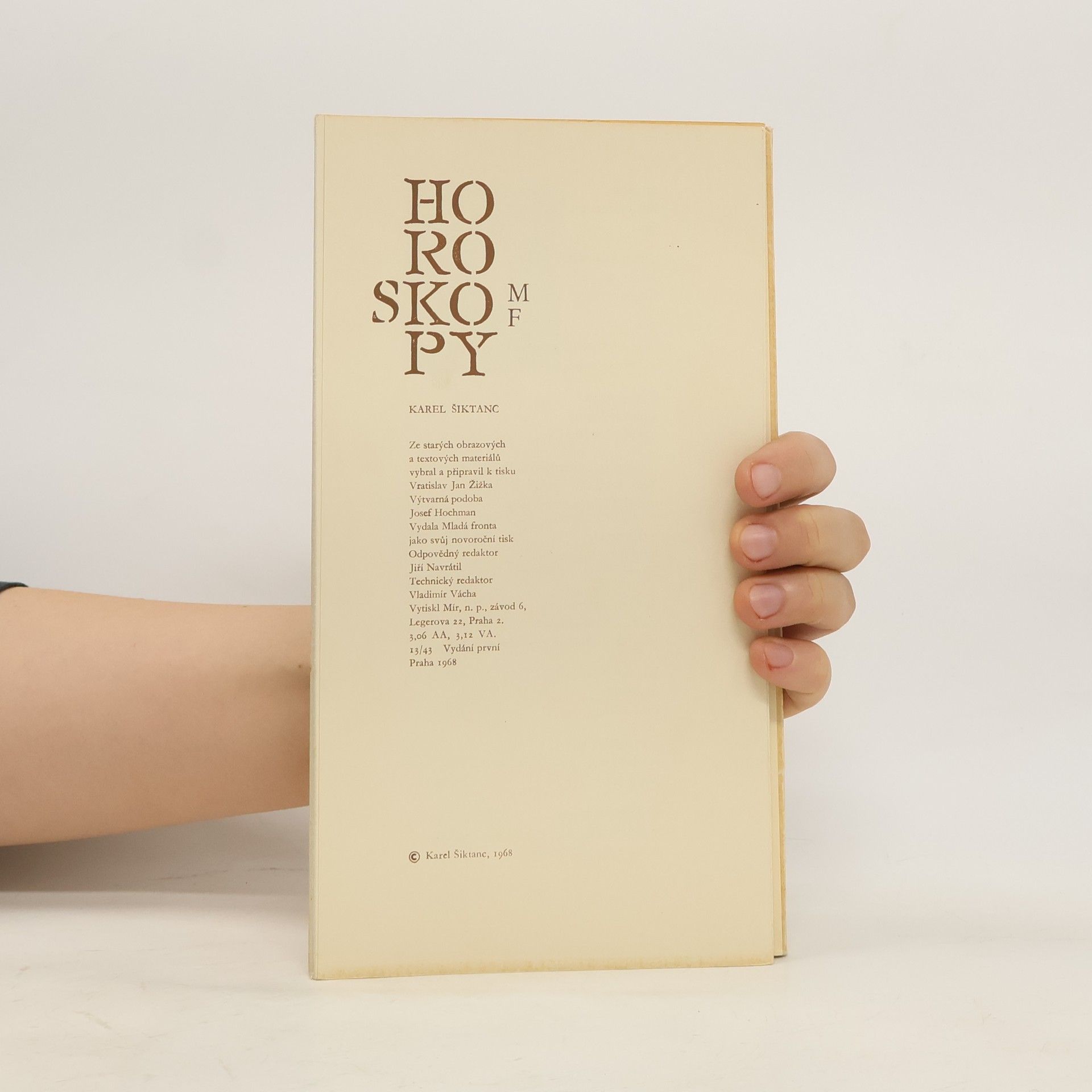Bibliofilské vydání sbírky, v níž se autor vybraným básnickým jazykem pokouší zobrazit znamení horoskopů z nejrůznějších pohledů Text Karel Šiktanc. Výtvarná podoba Josef Hofman a Vratislav Jan Žižka.
