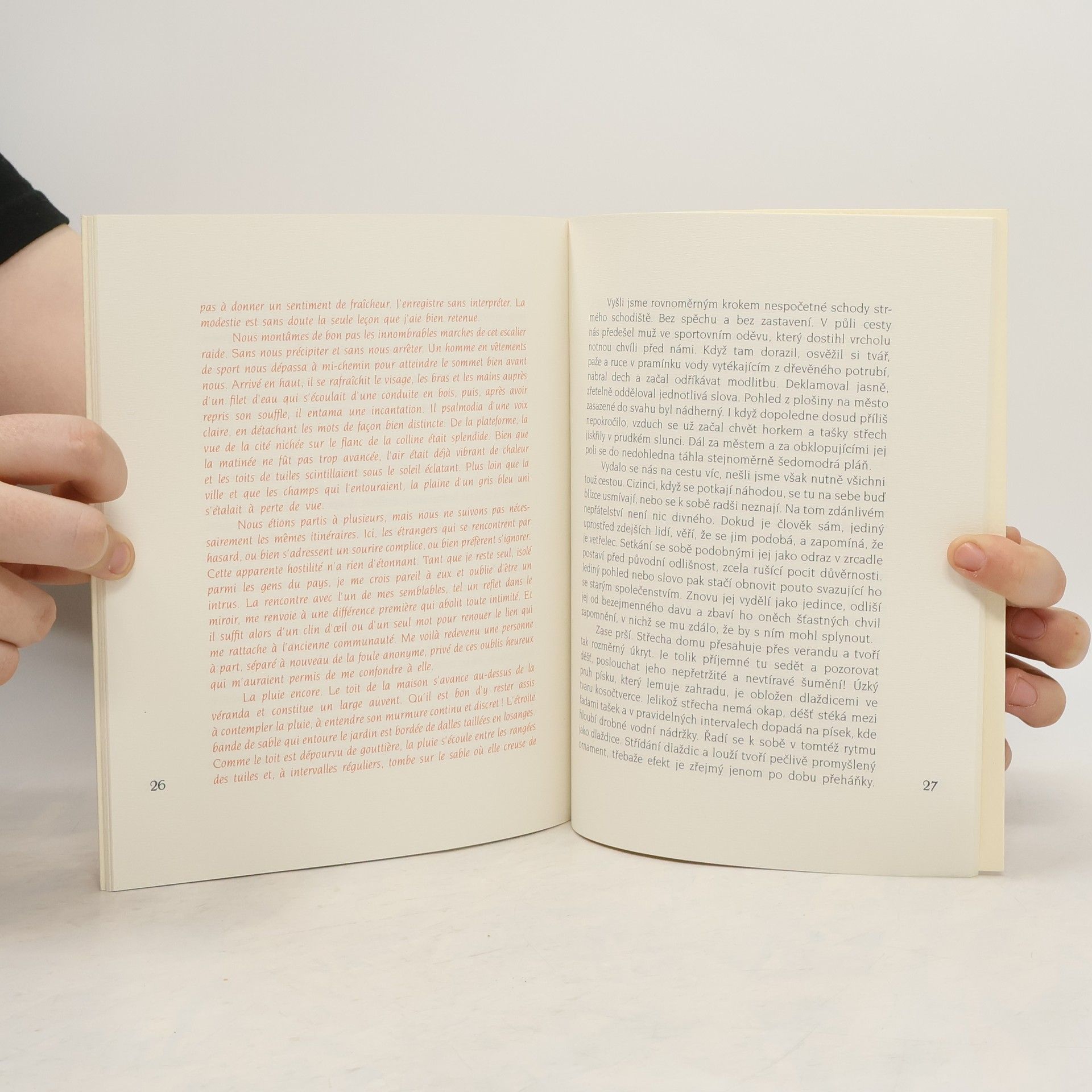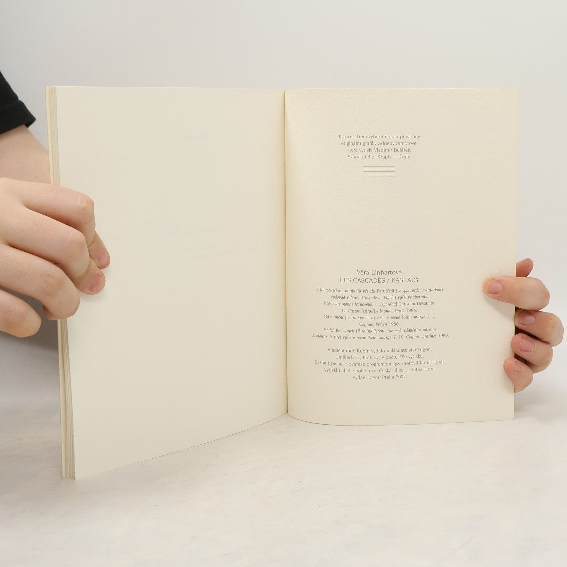 Souběžný francouzský text. Obsahuje: Vodopád v Nači = Cascade de Nachi -- Odmámení : kamenná zahrada v Rjóanži = Détrompe-l’oeil : le Jardine se de Ryôanji -- Smích bez zaujetí : zápisky z cesty = Rire indifférent : un carnet de voyage. K třiceti třem výtiskům jsou přivázány originální grafiky Adrieny Šimotové, které vytiskl Vladimír Bujárek.