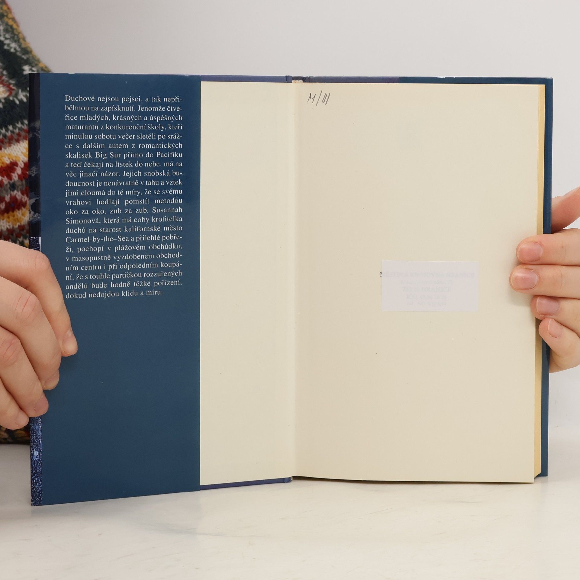 Duchové nejsou pejsci, a tak nepřiběhnou na zapísknutí. Jenomže čtveřice mladých, krásných a úspěšných maturantů z konkurenčí školy, kteří minulou sobotu večer sletěli po srážce s dalším autem z romantických skalisek Big Sur přímo do Pacifiku a teď čekají na lístek do nebe, má na věc jinačí názor. jejich snobská budouctnost je nenávrtně v tahu a vztek jimi cloumá do té míry, že se svému vrahovi hodlají pomstít metodou oko za oko, zub za zub. Susanahh Simonová, která má coby krotitelka duchů na starosti kalifornské město Carmel-by-the-sea a přelilehlé pobřeží, pochopí v plážovém obchůdku, v masopustně vyzdobeném obchodním centru i při odpoledním koupání,že s touhle partičkou rozzuřených andělů bude hodně těžké pořízení dokud nedojdou klidu a míru.