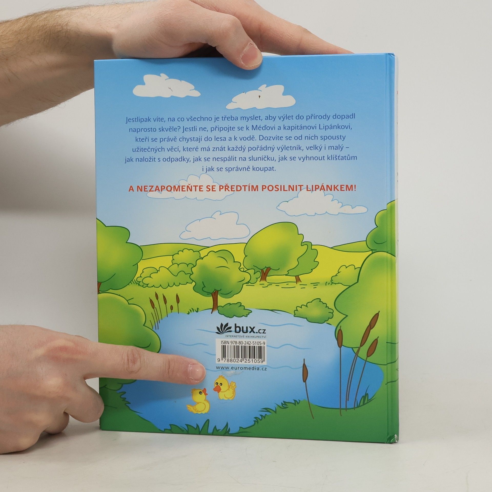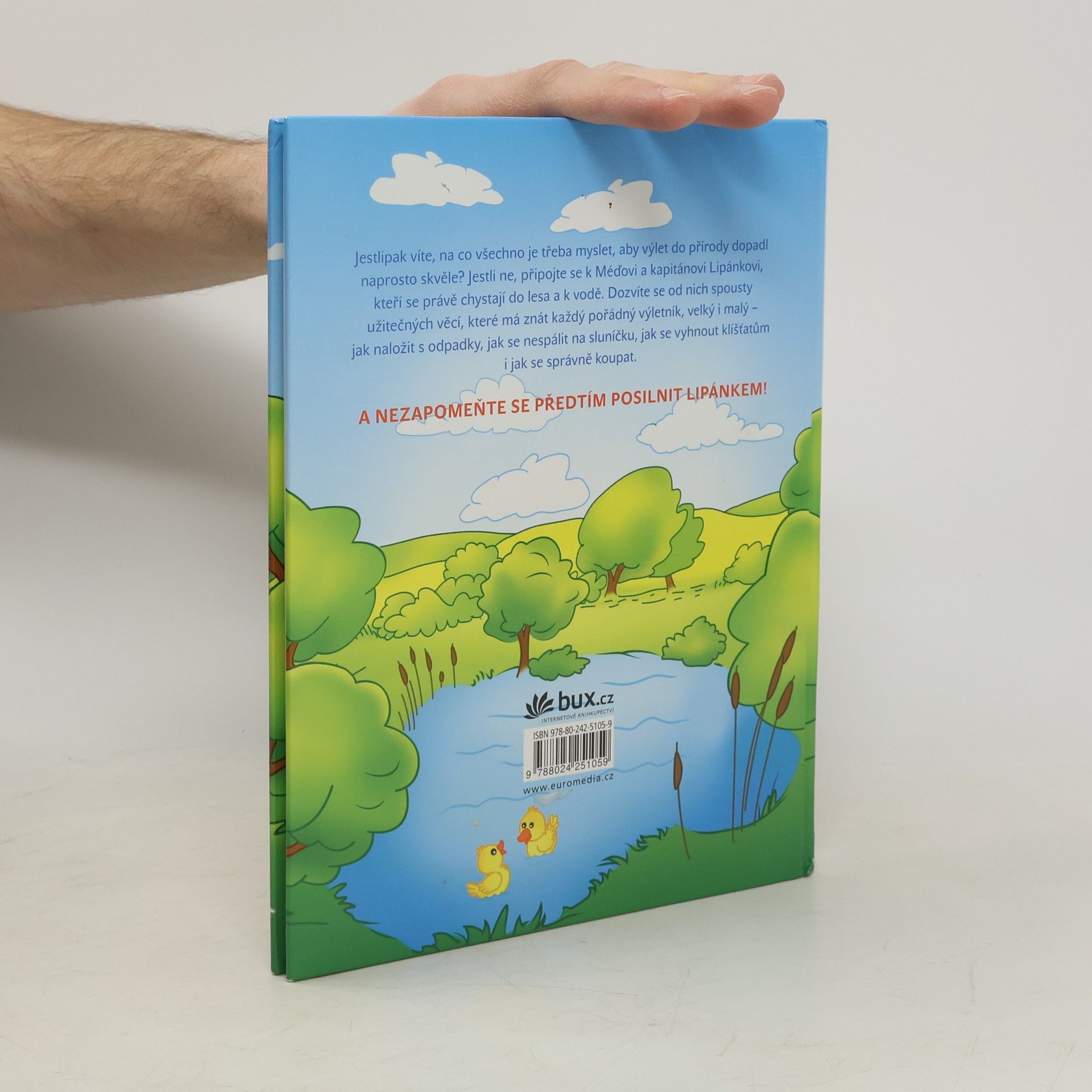 Jestlipak víte, na co všechno je třeba myslet, aby výlet do přírody dopadl naprosto skvěle? Jestli ne, připojte se k Méďovi a kapitánovi Lipánkovi, kteří se právě chystají do lesa a k vodě. Dozvíte se od nich spousty užitečných věcí, které má znát každý pořádný výletník, velký i malý – jak naložit s odpadky, jak se nespálit na sluníčku, jak se vyhnout klíšťatům i jak se správně koupat.