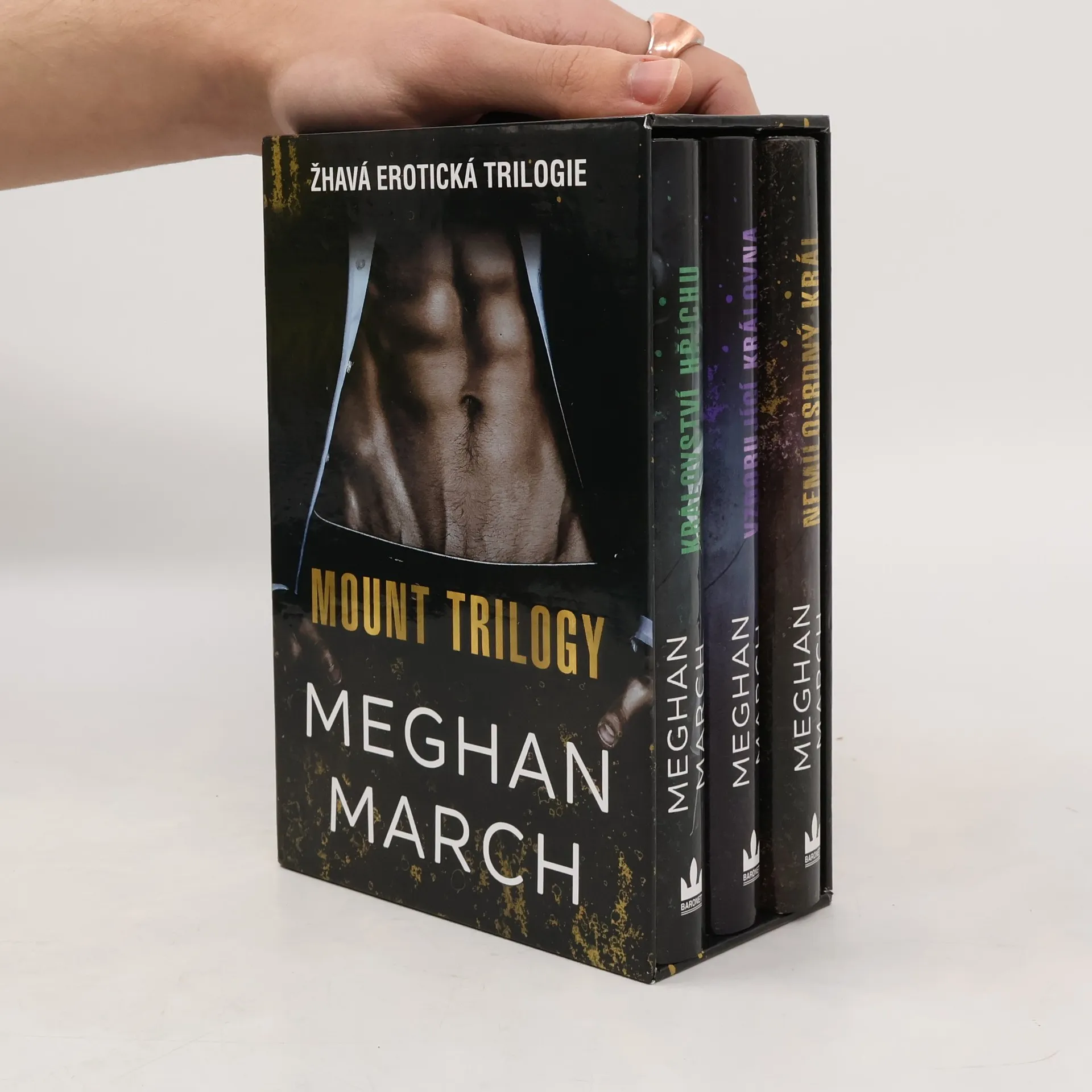 Úspěšná romantická erotická série MOUNT TRILOGY kompletně v boxu! Obsahuje knihy: Nemilosrdný král, Vzdorující královna a Království hříchu. New Orleans patří mně. Neznáte moje jméno, ale ovládám všechno, co vidíte – a taky všechno, co nevidíte. Můj vliv nezná hranic a mé požadavky jsou vždy splněny. Nemusel jsem půjčit peníze krachující rodinné palírně, ale těší mě, že je mám v hrsti. Že mám v hrsti ji. Neví, že mě zaujala. Měla být opatrnější. Bude moje. Dostanu ji. Možná si ji dokonce nechám. Je načase, aby mi splatila dluh. Keiro Kilgoreová, už jsi majetkem Lachlana Mounta.