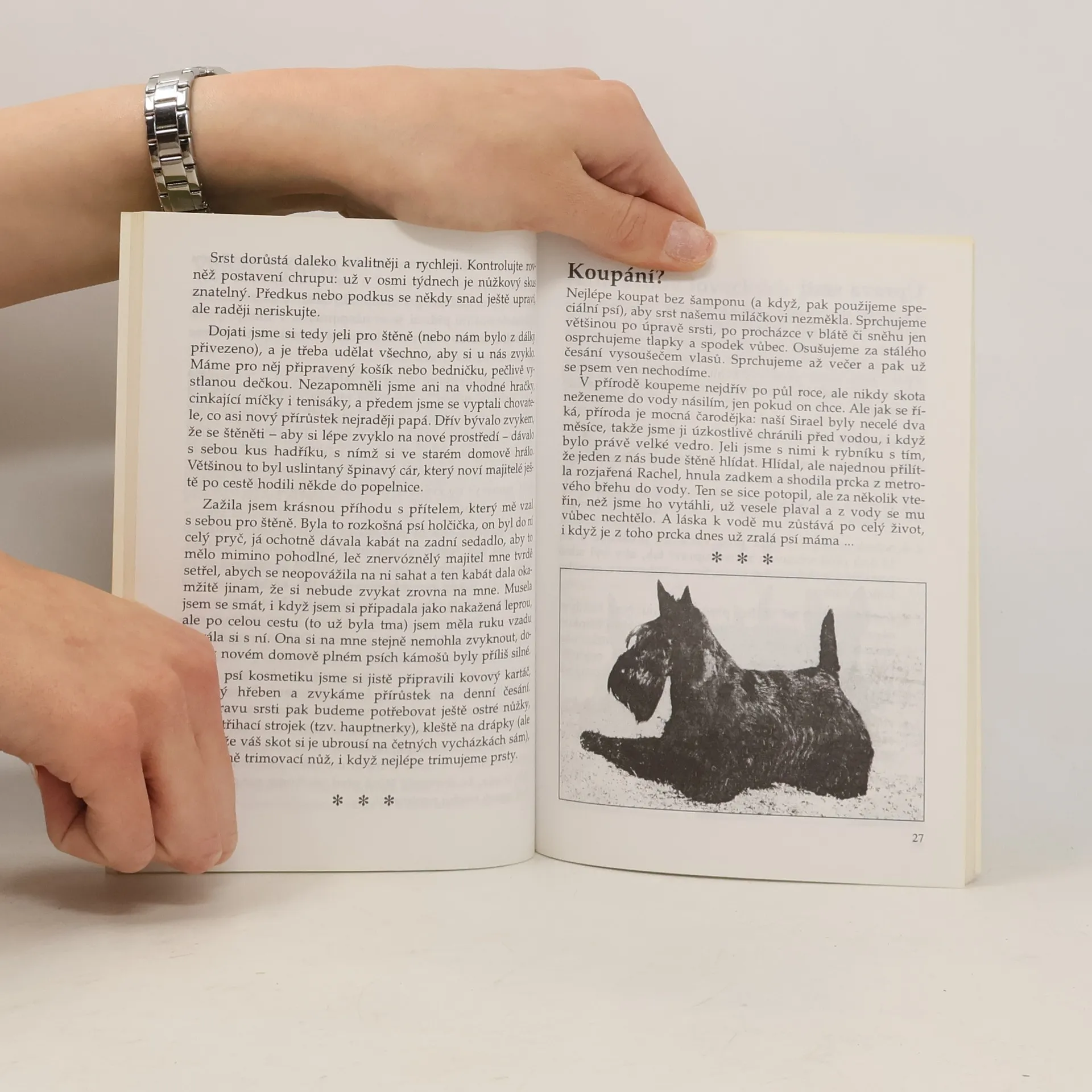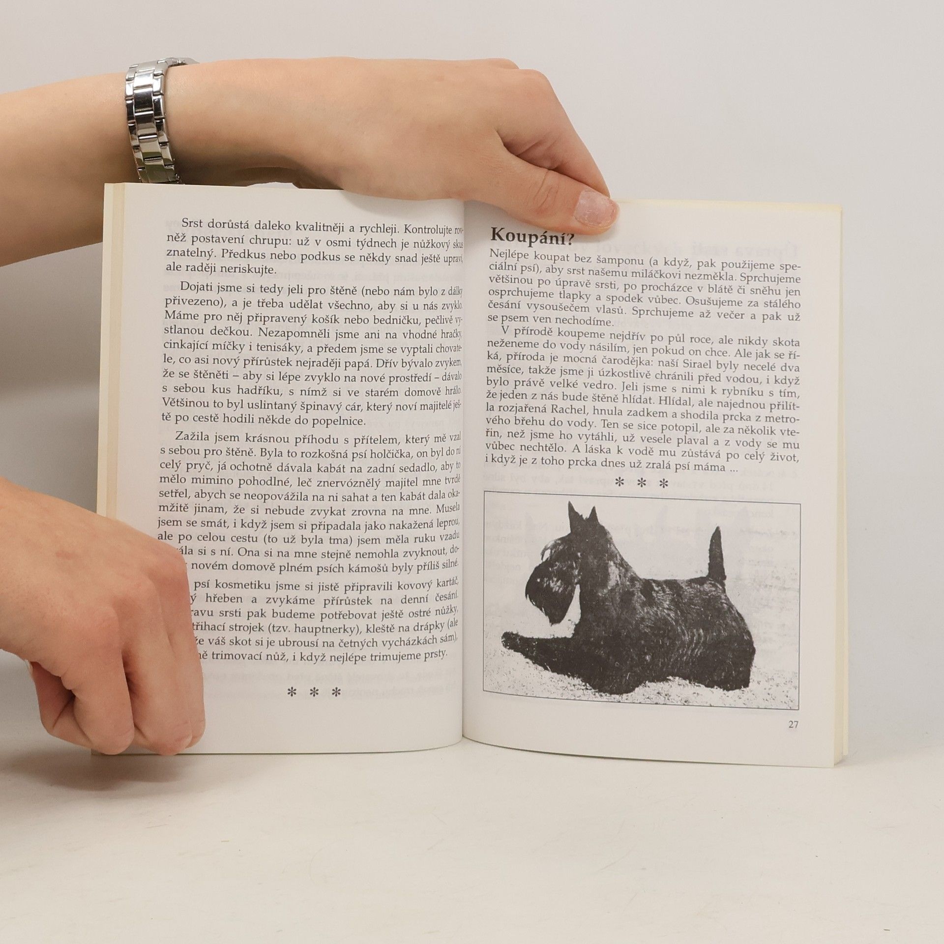 Nabízí rady týkající se výběru štěněte, návštěvy veterináře, koupání a úpravy srsti, vztahu psa k dětem, aj. Pozornost věnuje zejména otázkám chovu: krytí, porod, vývoj štěňat a vhodné krmení, sociabilita. Úvodní kapitoly se zabývají původem plemene skotský teriér a jeho historií, počátky čistokrevného chovu. Následuje popis typické tělesné stavby, charakteristika vystavování (druhy výstav, rozdělení psů do tříd, jarní svody loveckých psů). Kniha je psána osobním tónem, mimořádně čtivou a zábavnou formou (včetně veselých příhod ze života se skotským teriérem), je však také informativní. Nechybí četné ilustrace - vtipné obrázky, černobílé i barevné fotografie.... celý text